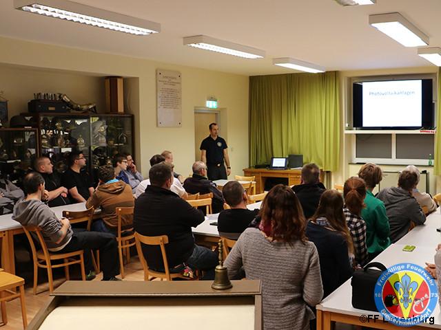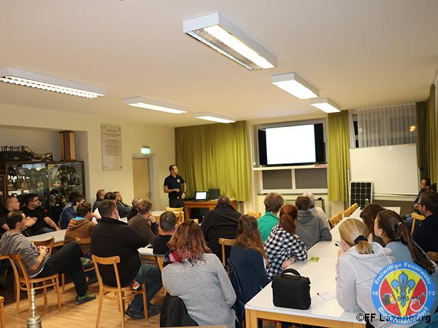 Eine weitere gemeinsame Schulung der Feuerwehren des Unterabschnittes 3, Biedermannsdorf und Laxenburg fand am Abend des 14.02.2017 im Feuerwehrhaus Laxenburg statt. Die Schulung befasste sich mit den Gefahren im Feuerwehreinsatz im Zusammenhang mit Photovoltaikanlagen. Als Vortragende fungierten Hr. Ing. Mag.(FH) Kurt Mühlgrabener von der Firma Enerix sowie der Kdt. Stv. der FF Laxenburg OBI Ing. Mario Hütter. Sämtliche Teilnehmer konnten wichtige Erfahrungen und teils neue Erkenntnisse für den Einsatz bei solchen Anlagen mitnehmen. Im Anschluss an die Schulung wurden die Teilnehmer noch vom Versorgungsdienst der FF Laxenburg mit faschierten Laibchen und Kartoffelpüree verköstigt. An der Schulung nahmen rund 40 Mitglieder der beiden Feuerwehren teil.