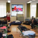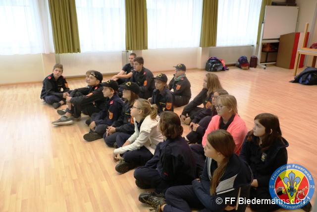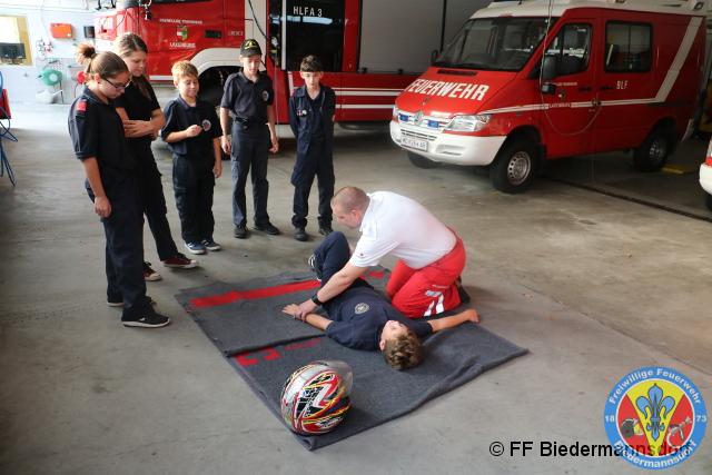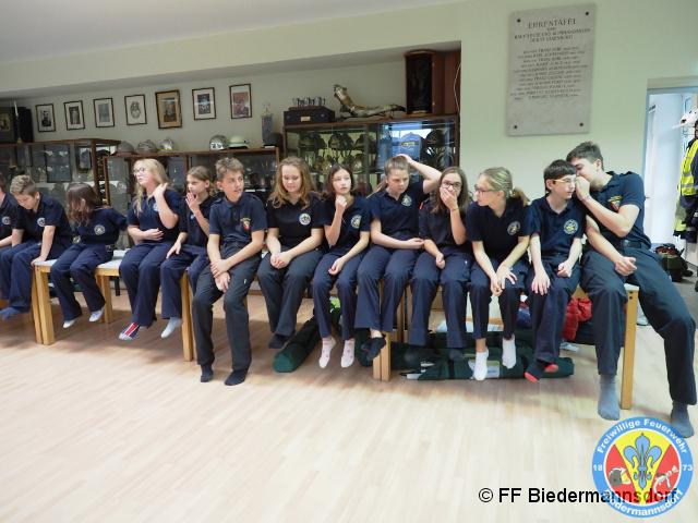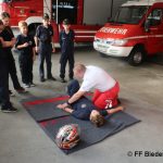 Nach dem Einsatz stand die nächste Schulung für die FJ-Mitglieder an. Bei der Schulung wurden ihnen Anfangs die Basic der Ersten Hilfe näher gebracht und in der Praxis wurde den Jugendlichen anhand einer Übungspuppe die richtige Reanimation, sowie das Anlegen eines Druckverbandes und die richtige Helmabnahme nach einem Verkehrsunfall vermittelt.