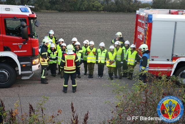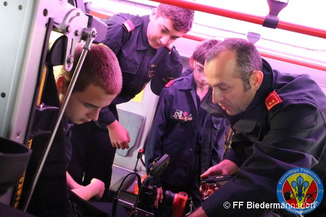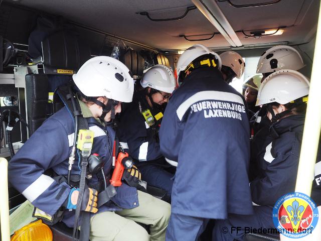 Da in der Realität Einsätze auch nicht vorhersehbar sind, wurde die Fahrzeugschulung dann durch den ersten (gestellten) Einsatz unterbrochen. Dieser wurde mittels Pager alarmiert und sogleich mussten sich die FJ-Mitglieder ihre Einsatzbekleidung anziehen und in der Fahrzeughalle treffen, um in weiterer Folge zu der alarmierten Einsatzörtlichkeit auszurücken.