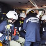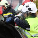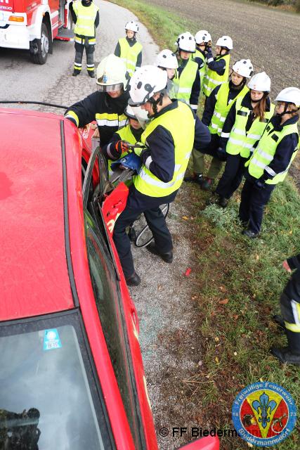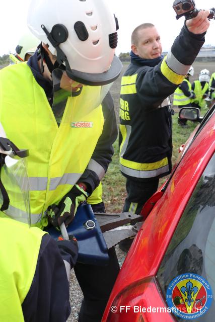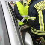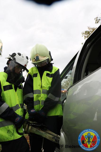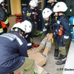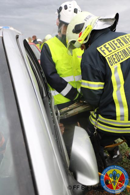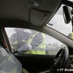 Am Vormittag dann erneut eine Ausrückung. Der Einsatzgrund war ein Verkehrsunfall mit 4 eingeklemmten Personen. Nach Absperrung der Verkehrsfläche, Aufbau des Brandschutzes und der Sicherung des Fahrzeuges gegen Abrollen, wurde mittels hydraulischen Rettungsgeräts die Menschenrettung begonnen. Wie alt gediente Profis wurde durch die junge Mannschaft der PKW in die erforderliche Form gedrückt und geschnitten um die verletzte Person aus dem Fahrzeug zu befreien.