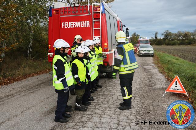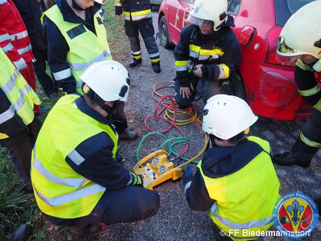 Die FJ-Mitglieder eilten erneut gemäß Ausrückeordnung zum Einsatzgeschehen. Nach Erkundung der Einsatzstelle durch den Einsatzleiter, wurde der Befehl gegeben die Person schonend und mittels Hebekissen zu retten. Die FJ-Mitglieder konnten rasch die Person mittels Hebekissen unter dem PKW hervor holen und dem fiktiv anwesenden Rettungsdienst übergeben.