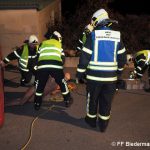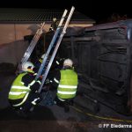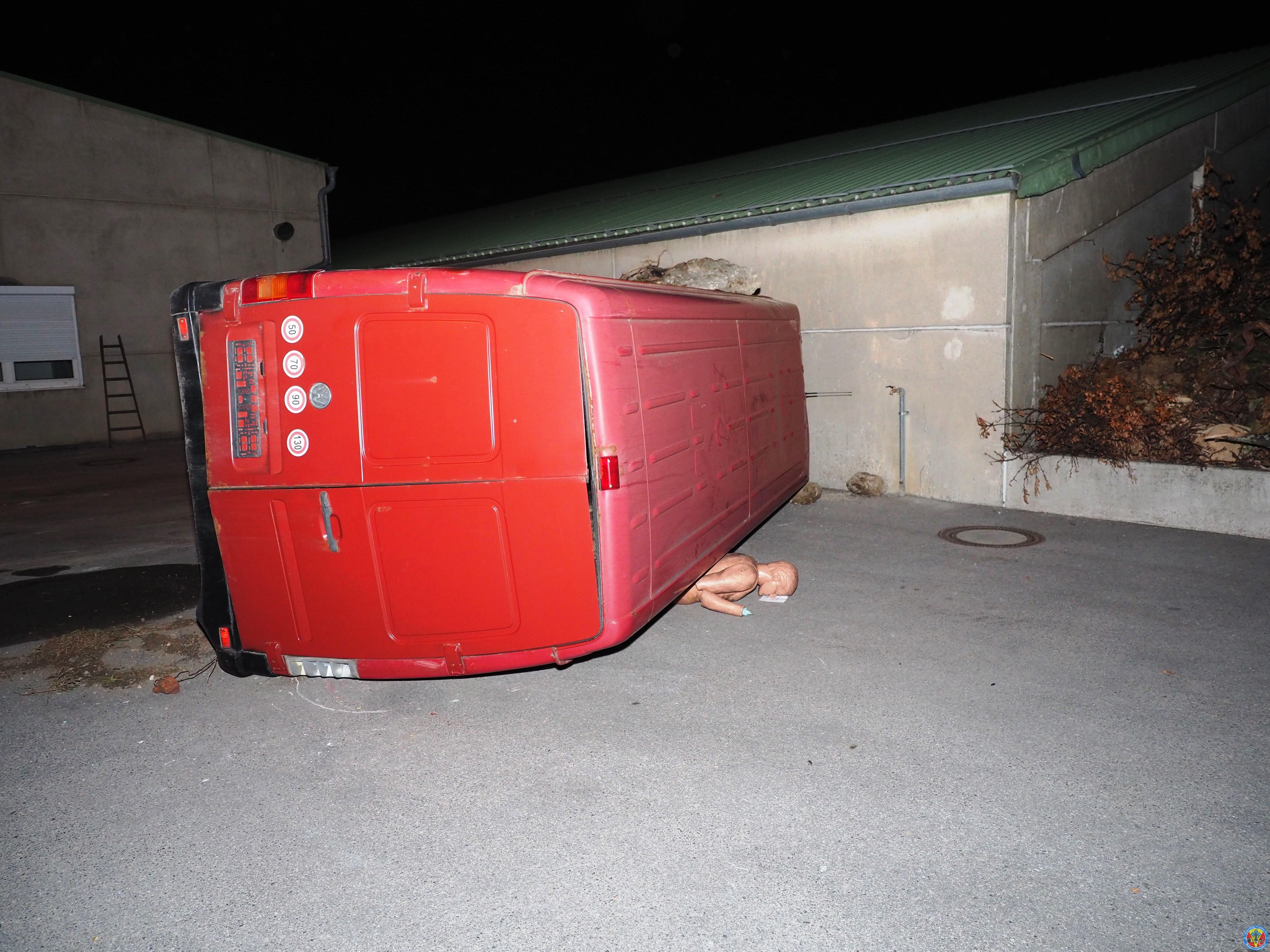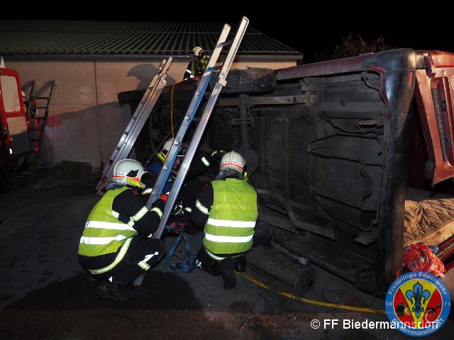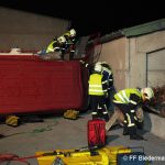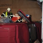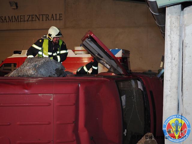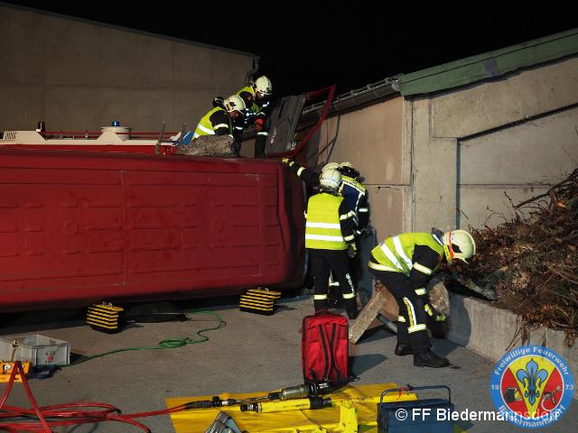 Nach einem Verkehrsunfall fuhr ein Klein-LKW in eine Hauswand welche daraufhin zum Umstürzen drohte. Unter dem Klein-LKW war eine Person eingeklemmt und aus der deformierten Fahrerkabine war ebenfalls eine Person zu befreien.