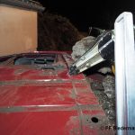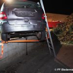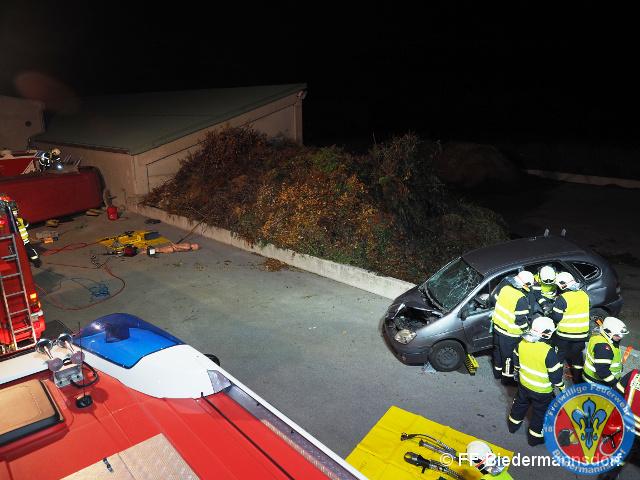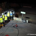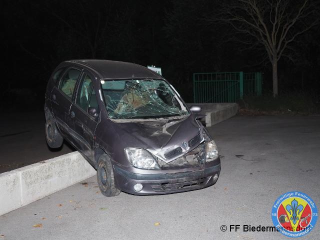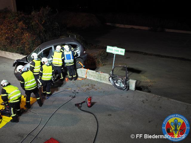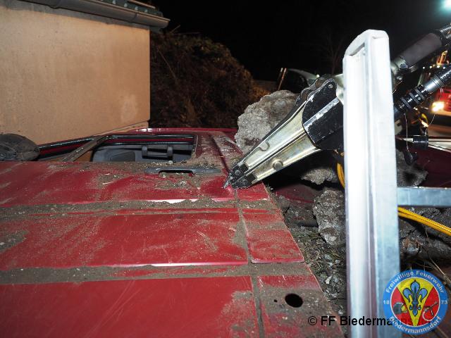 Der zweitbeteiligte PKW des Verkehrsunfalls wurde durch den Aufprall auf einen Mauervorsprung geschleudert. In dem PKW selber waren zwei Personen eingeklemmt.