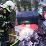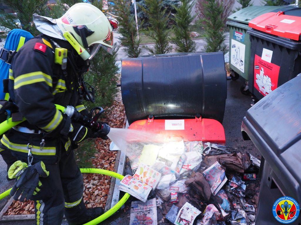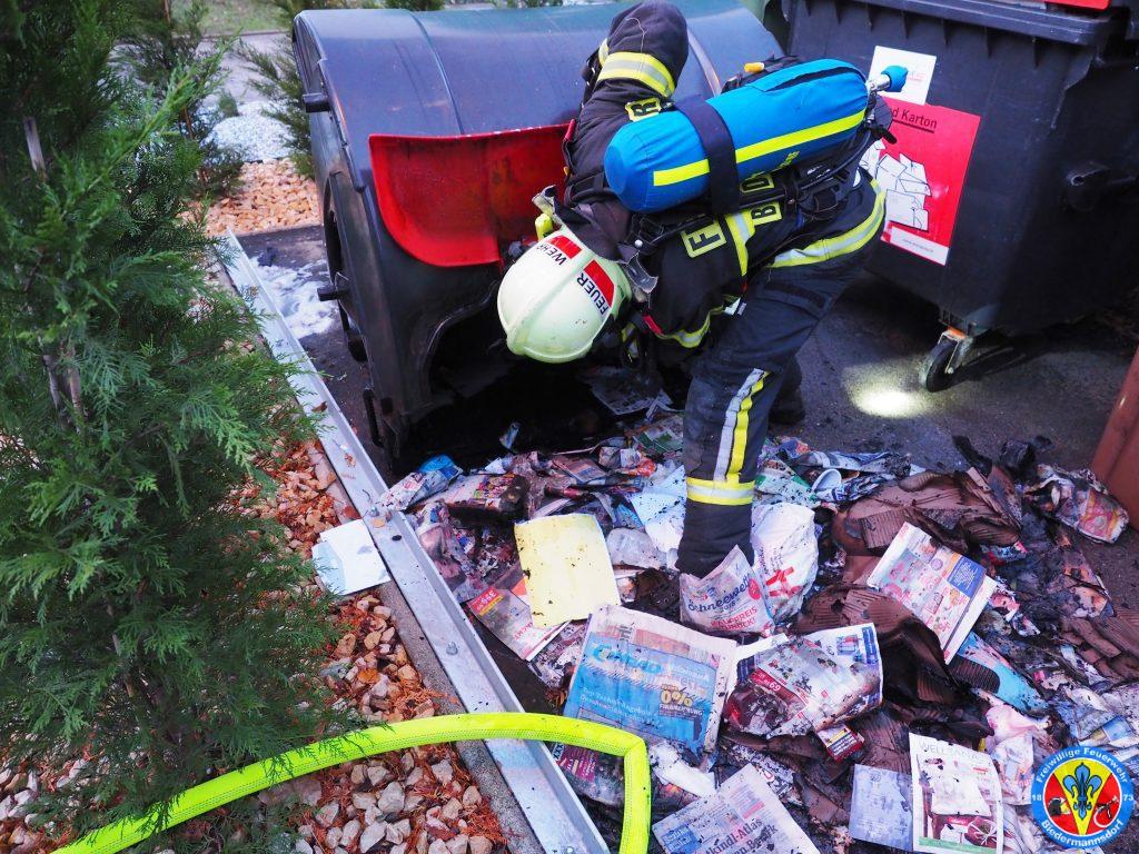 Durch den Atemschutztrupp wurde der noch leicht brennende Müllbehälter ausgeleert um den Inhalt vollständig ablöschen zu können. Nach dem „Brand aus“ wurde das Brandgut wiederum in den Müllbehälter geräumt um den Gehsteig frei zu halten.