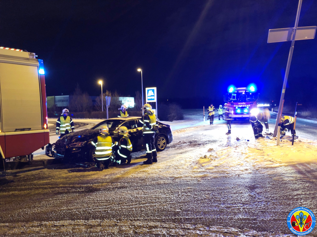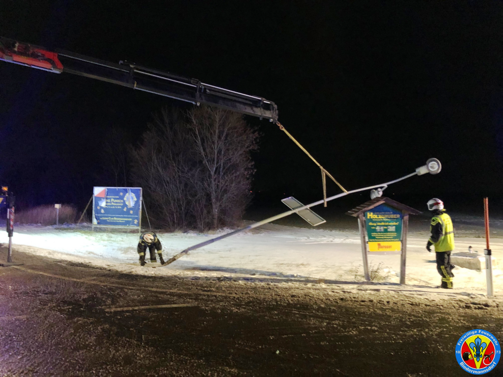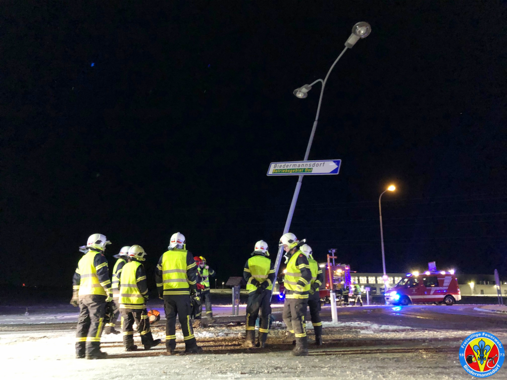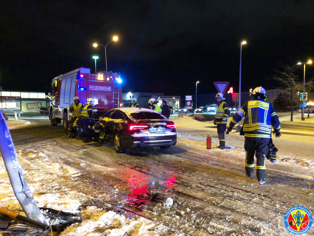 Vor Ort angekommen wurde wahrgenommen, dass ein PKW Lenker aus unbekannter Ursache in Schleudern geriet und an eine bei dem Kreisverkehr befindliche Straßenlaterne anfuhr. Die Straßenlaterne war durch den Aufprall dermaßen verbogen, dass diese in die gegenüberliegende Fahrbahn ragte. Der PKW war durch Unfall nicht mehr fahrbereit und musste durch uns von der Fahrbahn entfernt werden.
