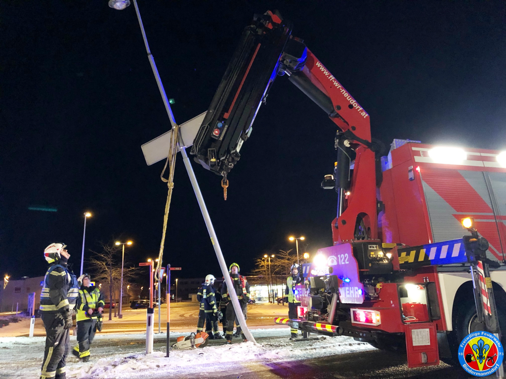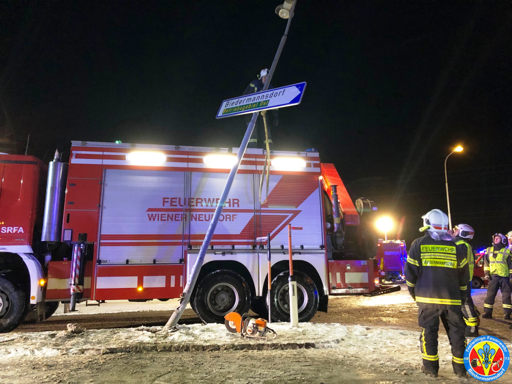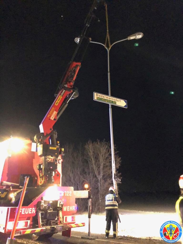 Um die Straßenlaterne ohne weitere Beschädigung zu entfernen, musste ein Kran zwecks Sicherung an die Einsatzörtlichkeit beordert werden. Auf Grund dessen wurde durch die BAZ Mödling das SRF („schweres Rüstfahrzeug“) der Freiwilligen Feuerwehr Wiener Neudorf an die Einsatzörtlichkeit in Biedermannsdorf entsandt. Mittels des Krans wurde der Lichtmast behutsam aus seiner Verankerung gezogen und im Straßengraben abgelegt.