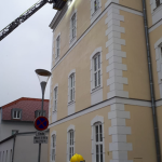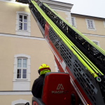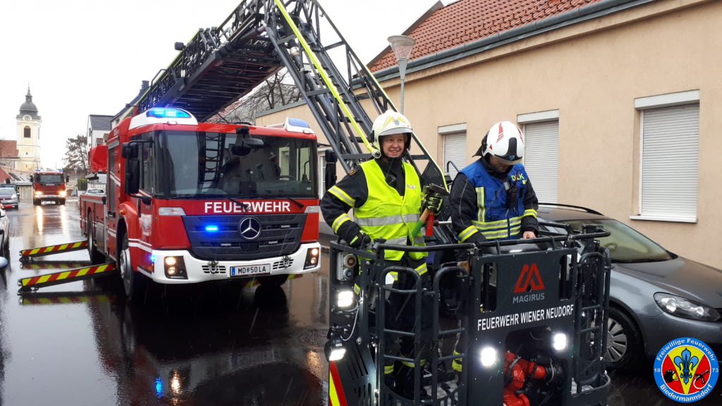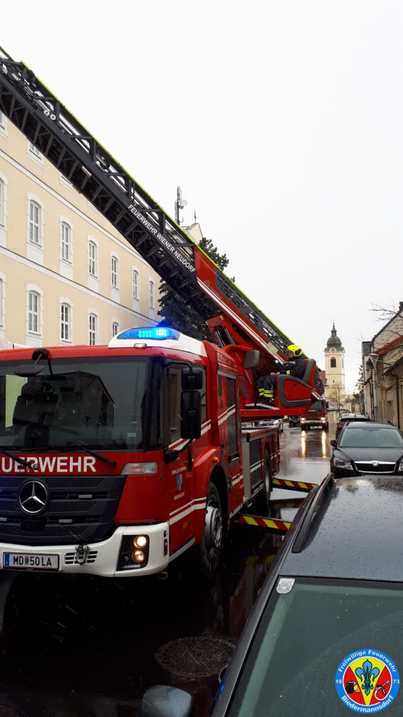 Zeitgleich wurde durch den Einsatzleiter per BAZ Mödling eine Drehleiter an die Einsatzörtlichkeit beordert. Kurze Zeit später traf die Drehleiter Wiener Neudorf bei der HLW ein. Mittels Drehleiter konnte zu den losen Fassadenteilen heran gefahren werden und diese mittels Werkzeug gelöst und sicher im Korb der Drehleiter verwahrt werden.