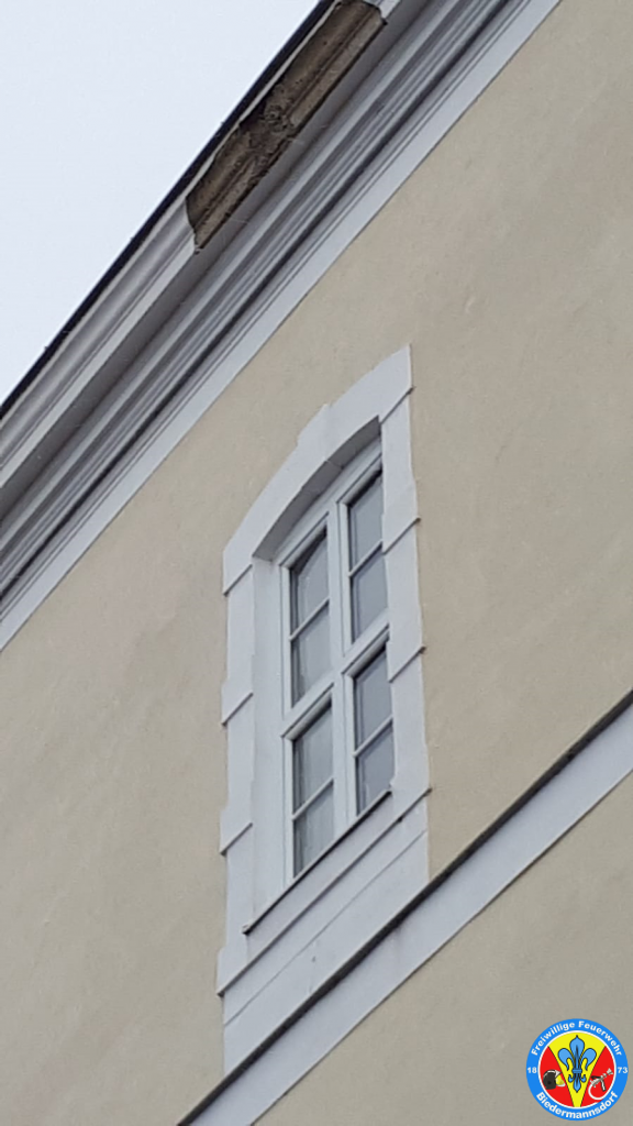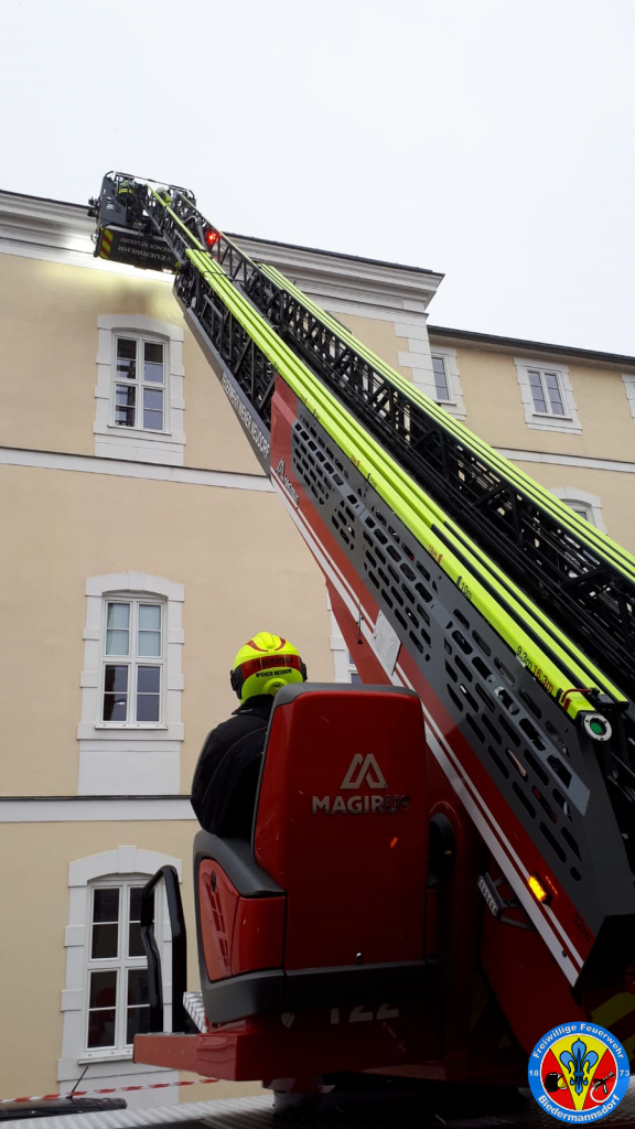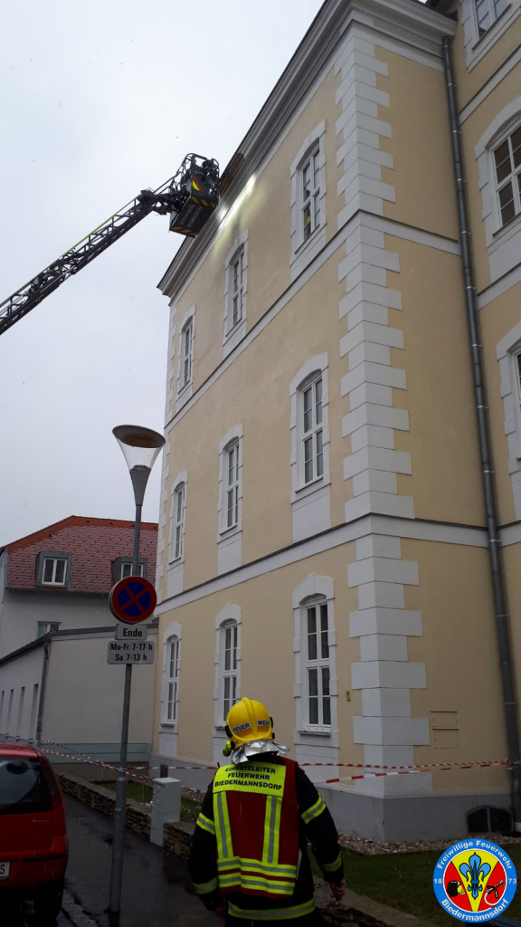Die akute Gefahr von herabstürzenden Teilen konnte vor Ort mit dem Einsatz der Drehleiter behoben werden, doch wurde die Schulleitung informiert dass der Schaden dringend durch eine Fachfirma zu beheben ist.