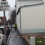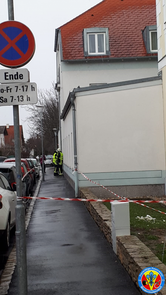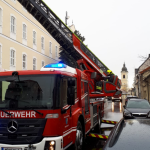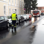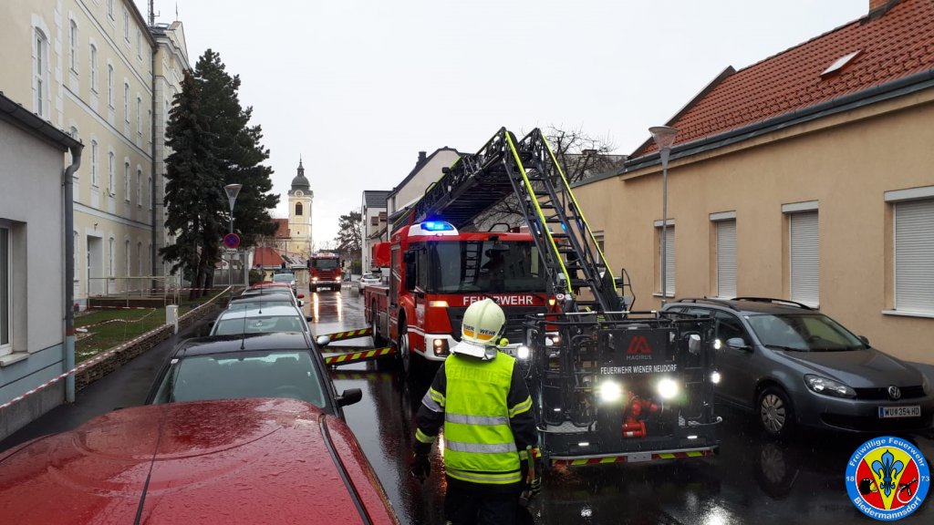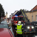Kurze Zeit später fuhr das RLF-A unter der Leitung des HBI Werner WLASCHITZ die Einsatzörtlichkeit an, wo vor Ort wahrgenommen wurde, dass sich vermutlich durch den anhaltenden Wind Fassadenteile auf der Höhe des Sims zum Dach lösten. Diese fielen herab und wurden durch den Wind dermaßen vertragen dass ein großräumiger Sperrbereich aufgezogen werden musste. In Zusammenarbeit mit der Exekutive wurden mehrere PKW Zulassungsbesitzer eruiert, um die dort abgestellten PKW von der Örtlichkeit zu verschaffen um so weiteren Schaden hintanzuhalten.