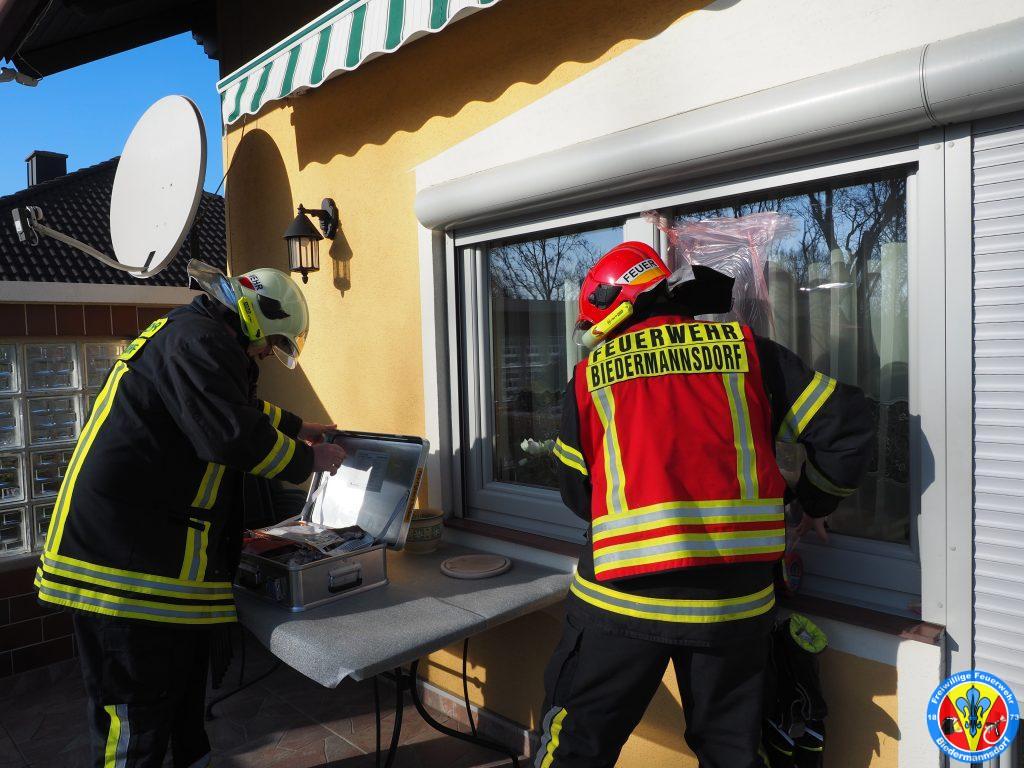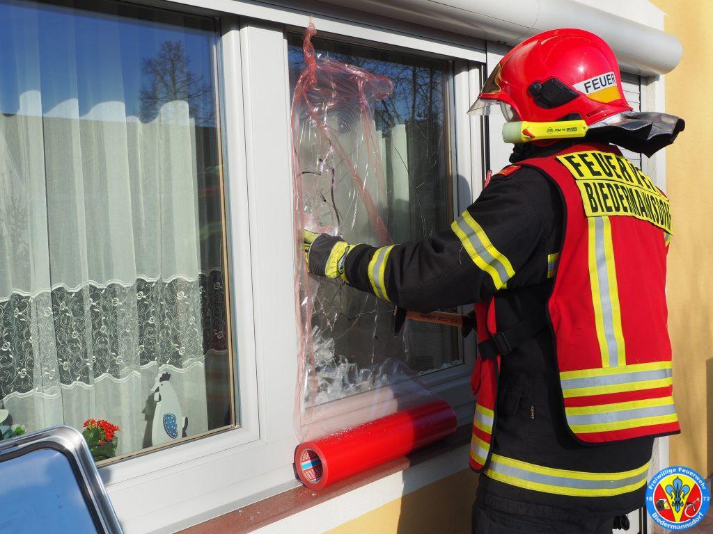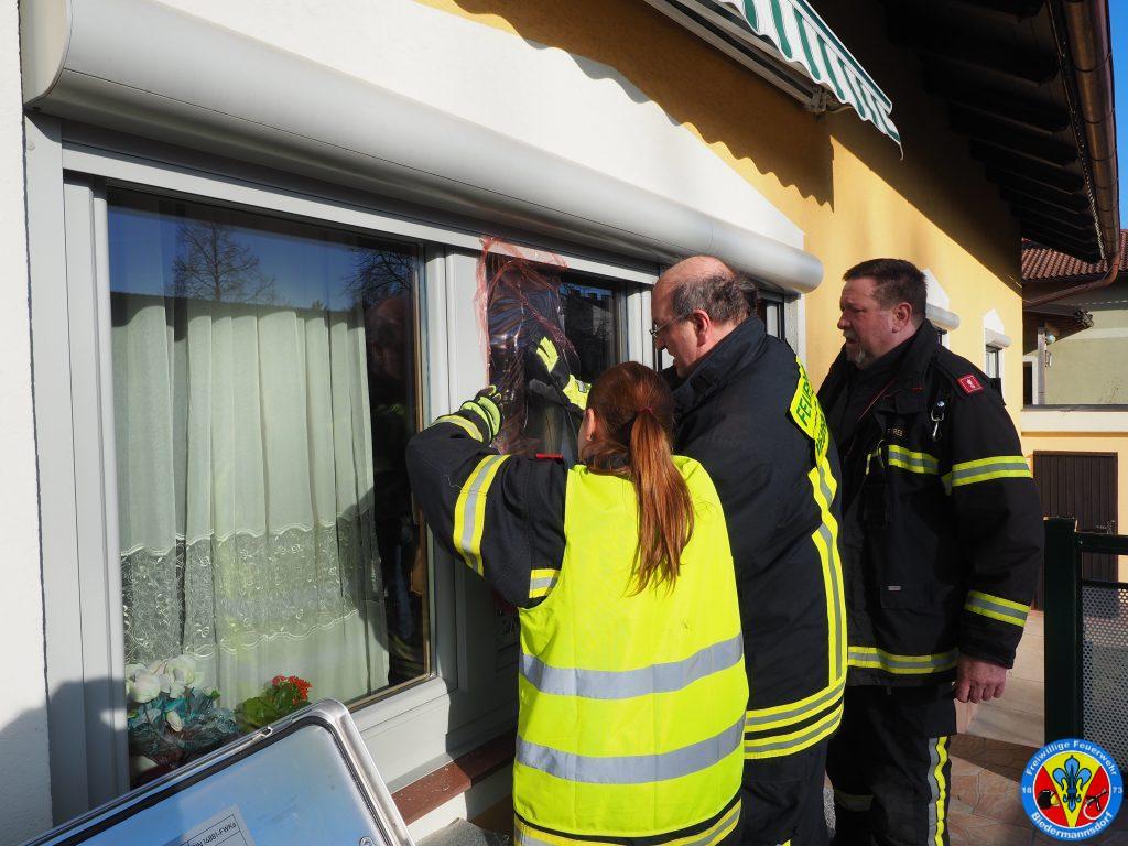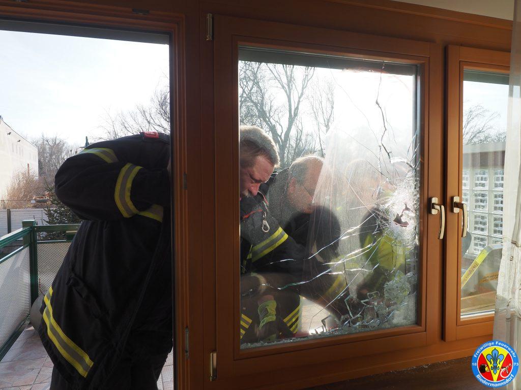 Da keine Türe oder ein Fenster offen bzw. gekippt war, wurde durch den Einsatzleiter entschieden ein Fenster auf Höhe Terrasse einzuschlagen, um schnellstmöglich einen Zugang zu schaffen.