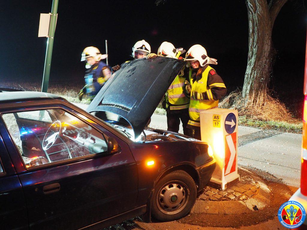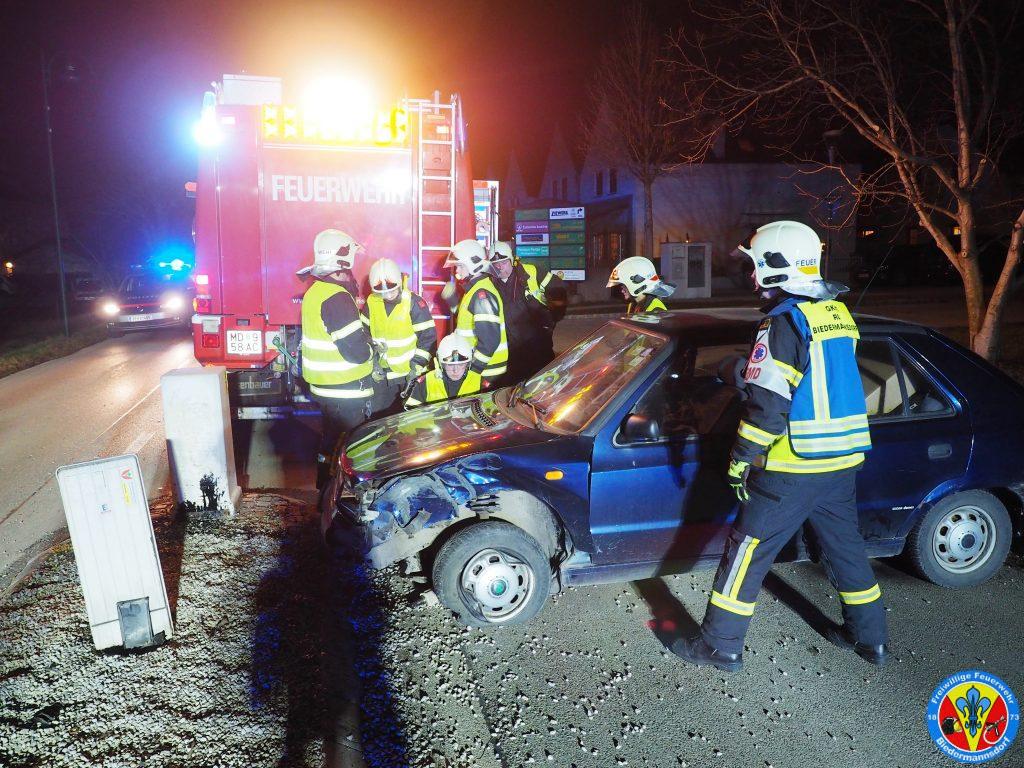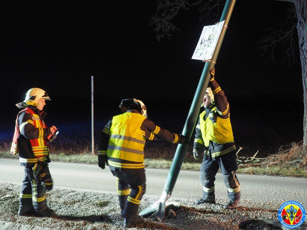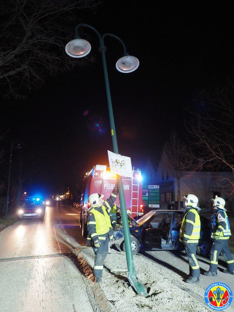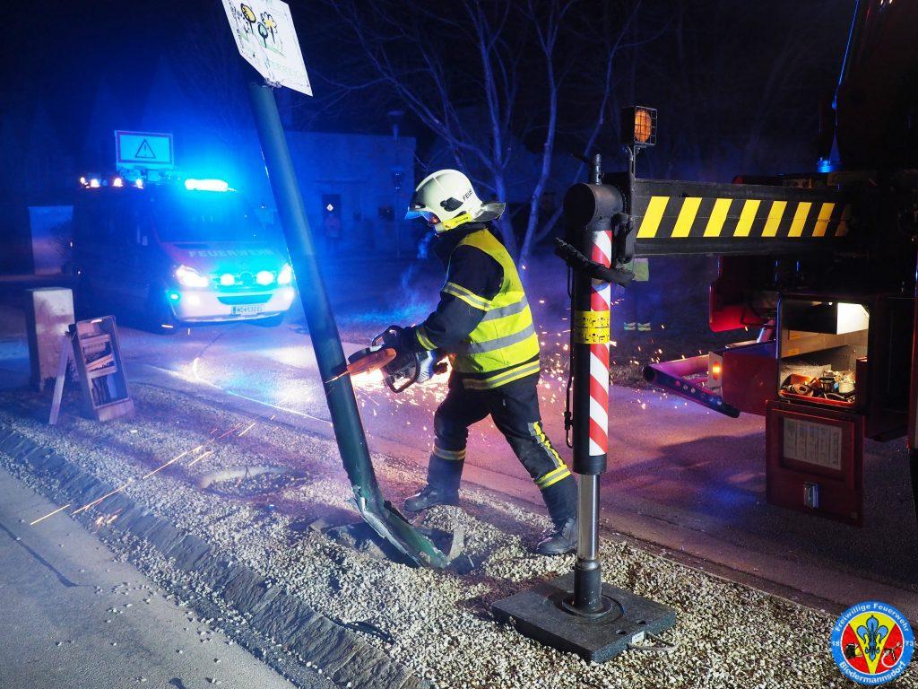 Kurze Zeit später fuhren zwei Einsatzfahrzeuge die Unfallörtlichkeit an. Durch den Einsatzleiter BM Harald MEIXNER wurde festgestellt, dass ein PKW auf eine Verkehrsinsel auffuhr und dadurch ein Verkehrszeichen aus der Verankerung riss und eine Straßenlaterne dermaßen anfuhr, dass diese drohte umzustürzen.