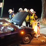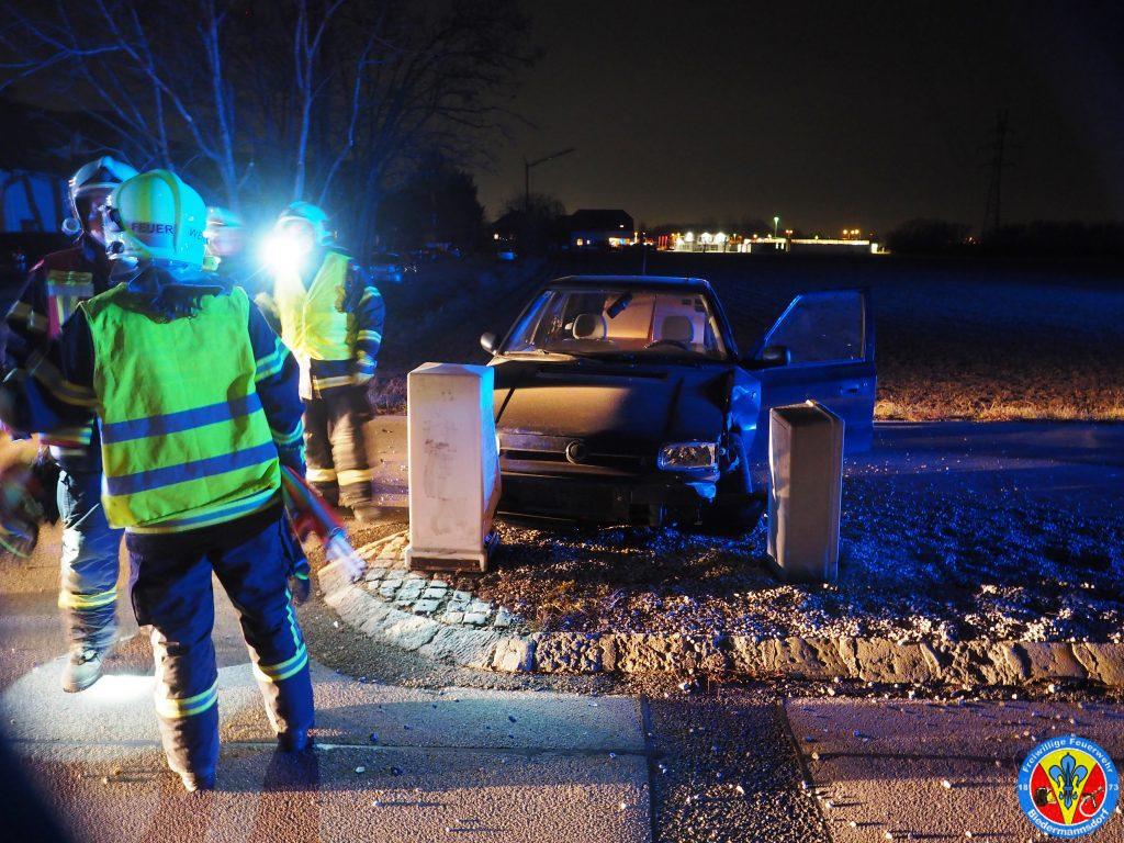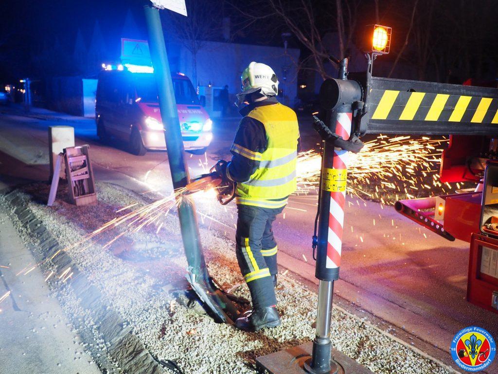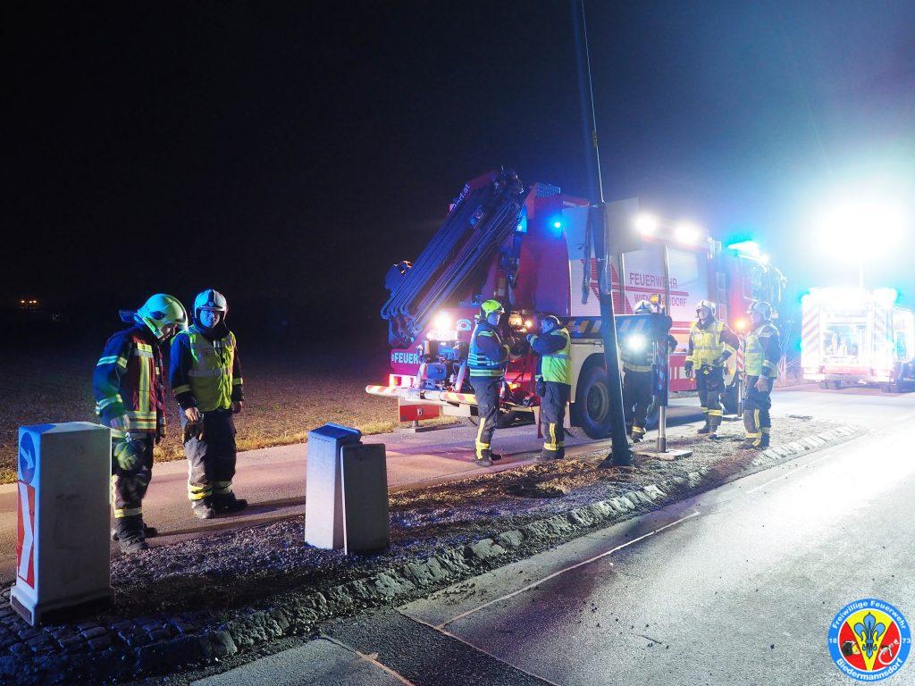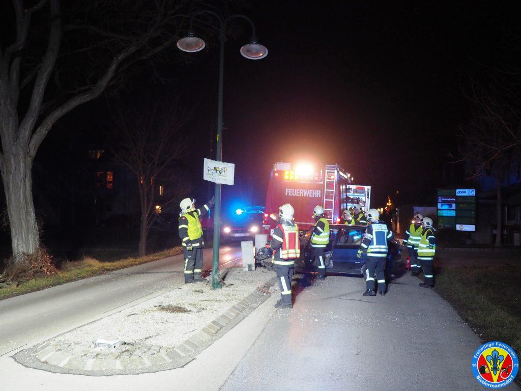 Kurze Zeit später fuhren zwei Einsatzfahrzeuge die Unfallörtlichkeit an. Durch den Einsatzleiter BM Harald MEIXNER wurde festgestellt, dass ein PKW auf eine Verkehrsinsel auffuhr und dadurch ein Verkehrszeichen aus der Verankerung riss und eine Straßenlaterne dermaßen anfuhr, dass diese drohte umzustürzen.