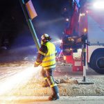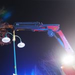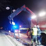 Durch den Einsatzleiter wurde ein Kran an die Einsatzörtlichkeit beordert um die Straßenlaterne gesichert abzubauen.