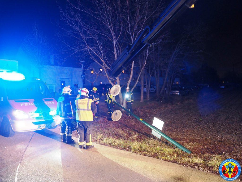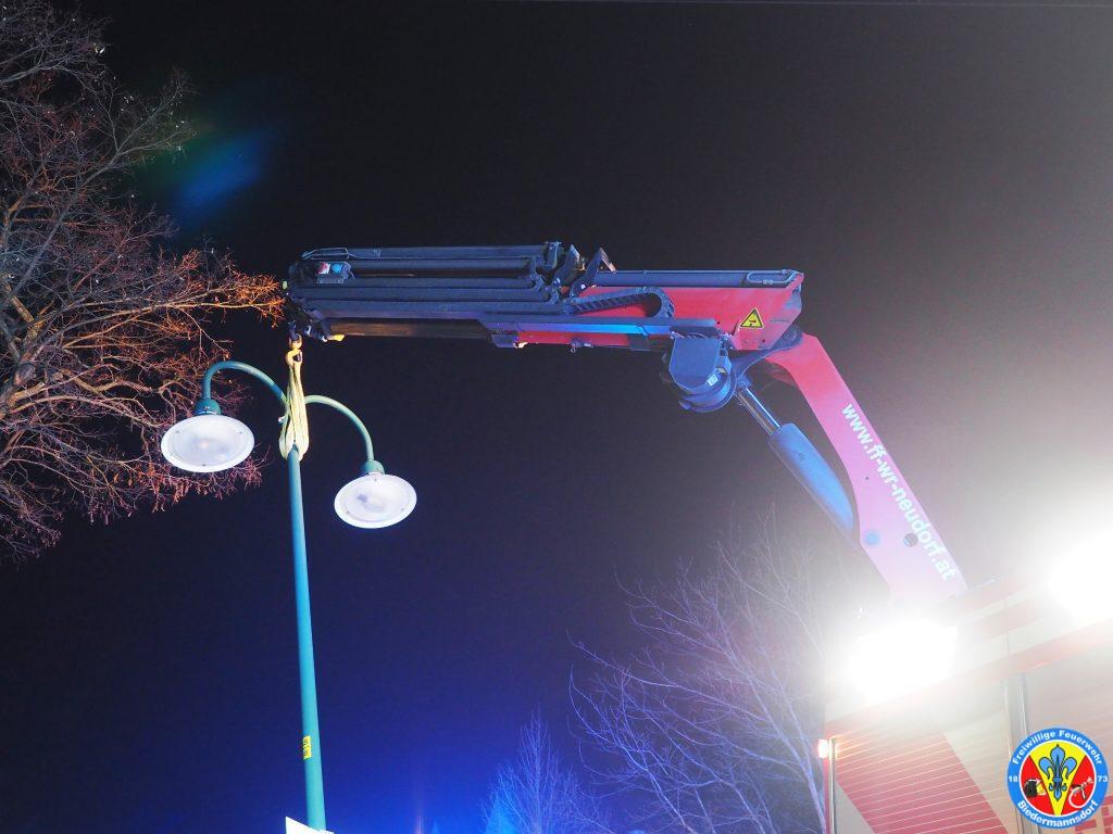 Kameraden der Freiwilligen Feuerwehr Wiener Neudorf fuhren daraufhin ebenfalls die Einsatzörtlichkeit an um mittels Kran des schweren Rüstfahrzeuges die Laterne zu sichern um den Abbau ohne Gefährdung zu ermöglichen.