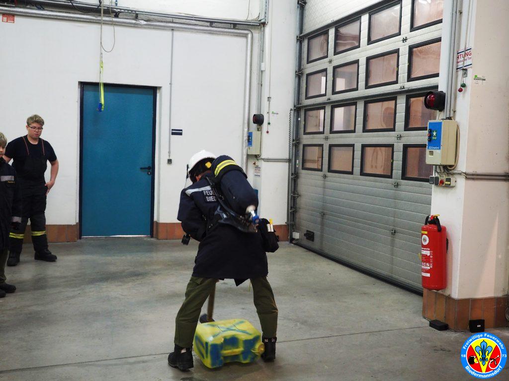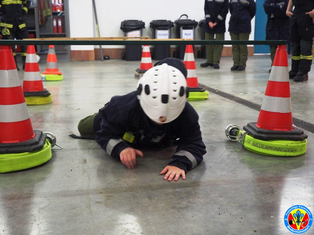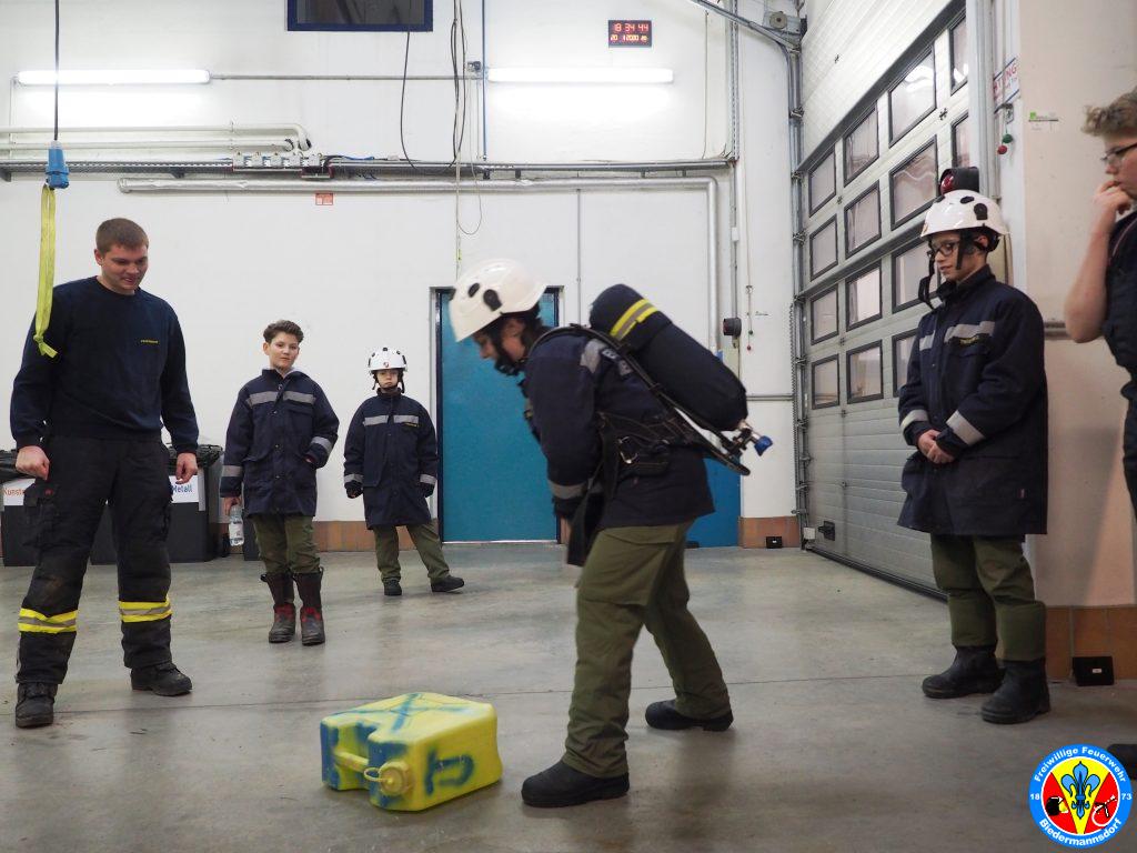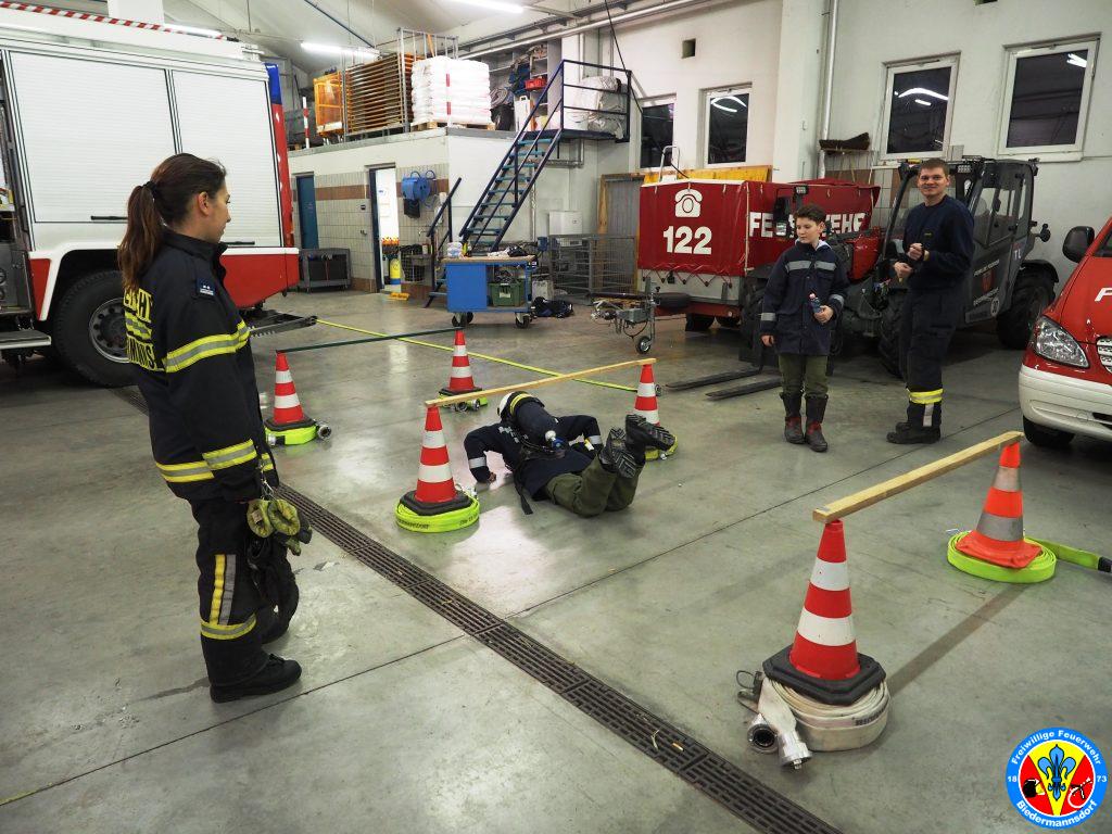 Im Anschluss daran legten die Feuerwehrjugendmitglieder das Atemschutzgerät an und absolvierten die für die Kinder adaptierten Stationen.