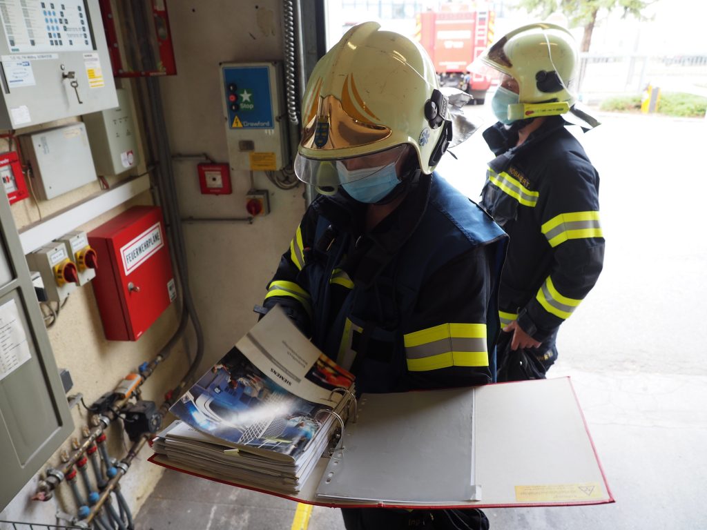Kurz nach der Alarmierung rückte der Branddienst-Zug zu der Einsatzörtlichkeit aus. Bereits während der Anfahrt rüsteten sich zwei Atemschutztrupps mit luftunabhängigem Atemschutz aus, um vor Ort sofort in den Einsatz gehen zu können.