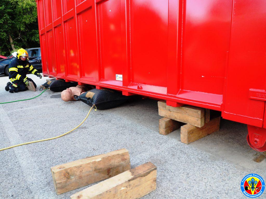 Das zeitkritische Anheben und Sichern von Lasten stand heute für die 1. Gruppe am Ausbildungsplan. Die richtige Handhabung und Positionierung vom hydraulischen Rettungsgerät sowie von Hebekissen wurde vorgezeigt und geübt. In weiterer Folge war die Sicherung mit Unterlegshölzern, sowie die schonende Menschenrettung aus lebensbedrohlichen Zwangslagen Thema, welches besprochen und sogleich praktisch geübt wurde. Gemäß Ausbildungsplan wird nächste Woche die 2. Gruppe das selbige Thema üben.