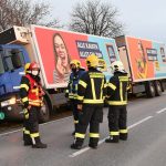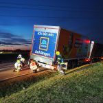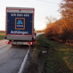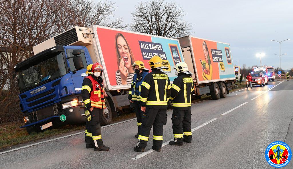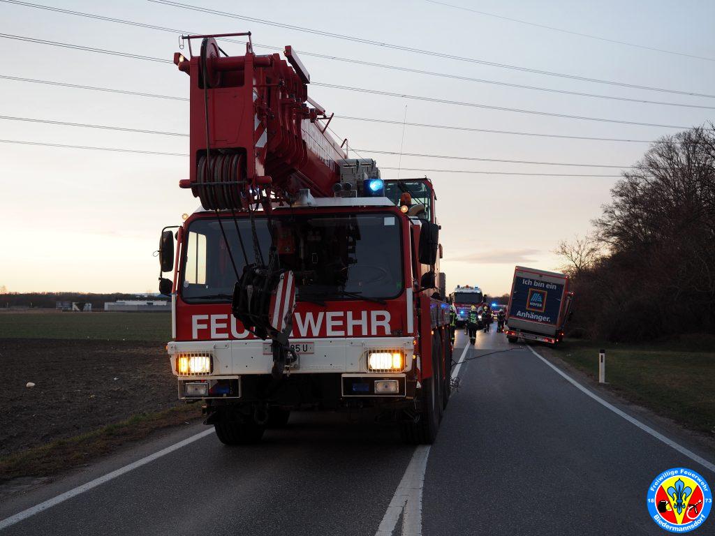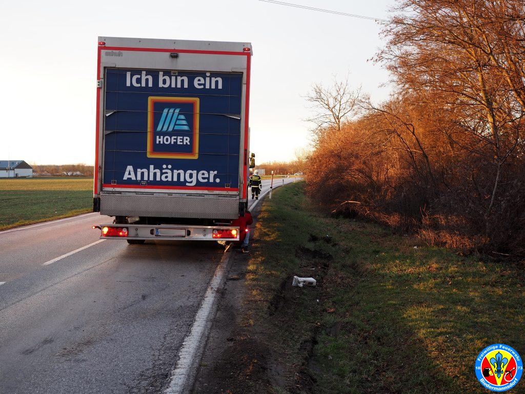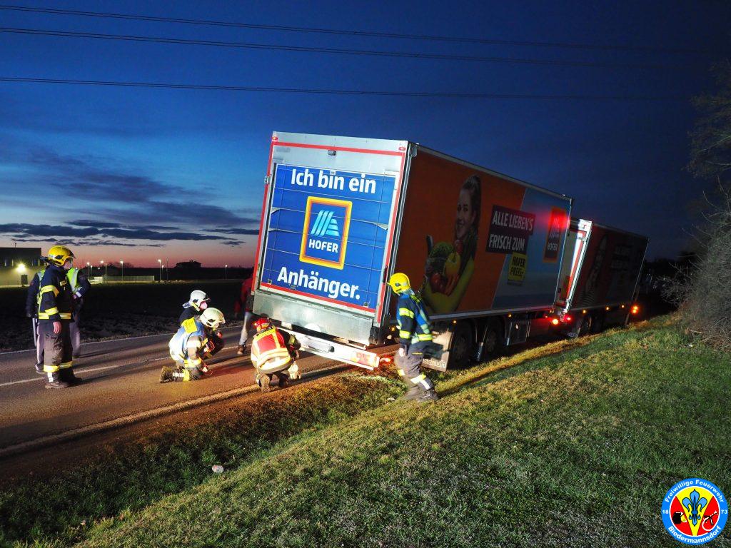 Kurze Zeit später rückte die erste Coronabereitschaftsgruppe in Richtung Einsatzörtlichkeit aus. Vor Ort stellte sich die Lage anders als erwartet dar. Nicht ein Klein-LKW stand im Graben, sondern ein Drei-Achs LKW samt Anhänger.