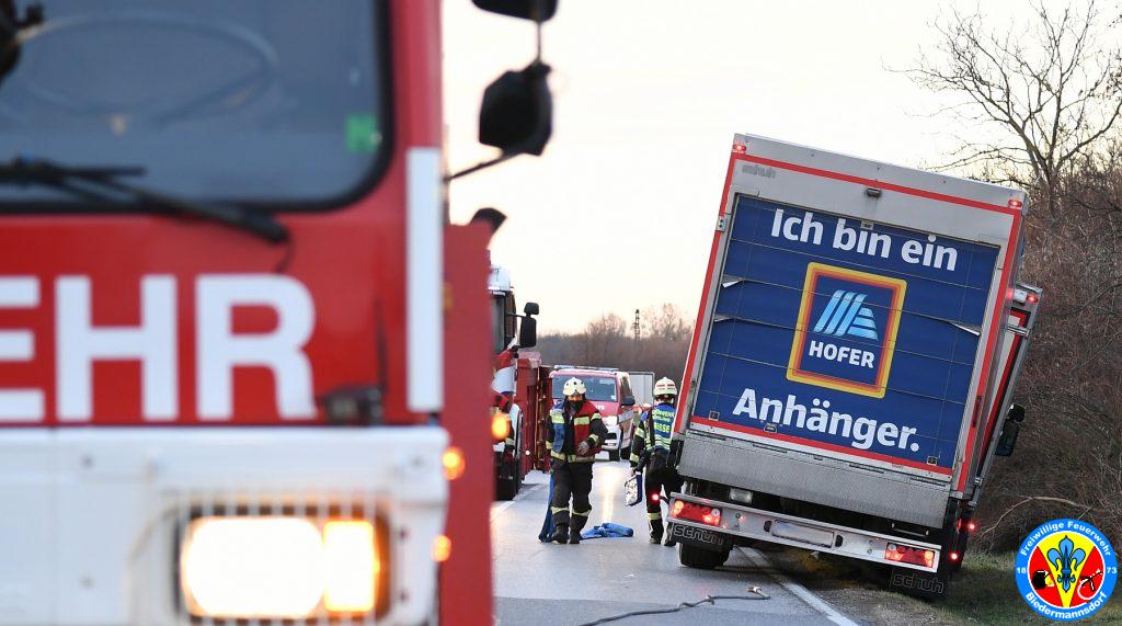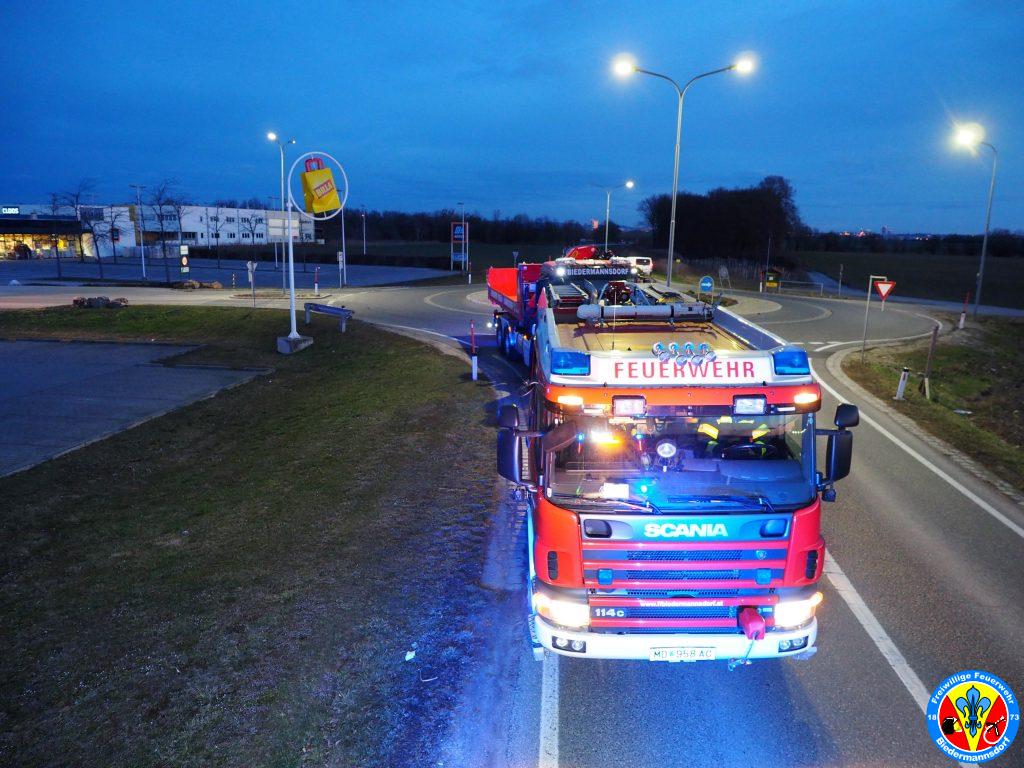 Durch die Bergungsspezialisten der Freiwilligen Feuerwehr der Stadt Mödling wurde der LKW samt Anhänger mittels 20to Seilwinde des Kranfahrzeuges geborgen. Nach Demontage des gebrochen Kotflügels konnte der LKW Fahrer mit seinem an sich unbeschädigten LKW die Fahrt wiederum fortsetzen und für volle Milchregale am Samstagmorgen sorgen.