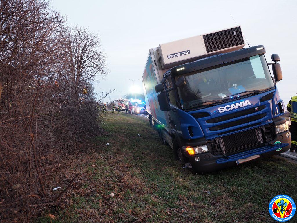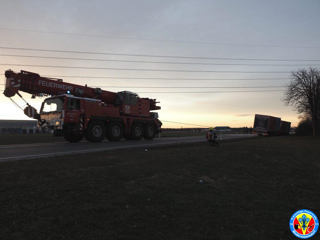 „T1, LKW Bergung, LKW mit Hänger ca. 6to im Graben“