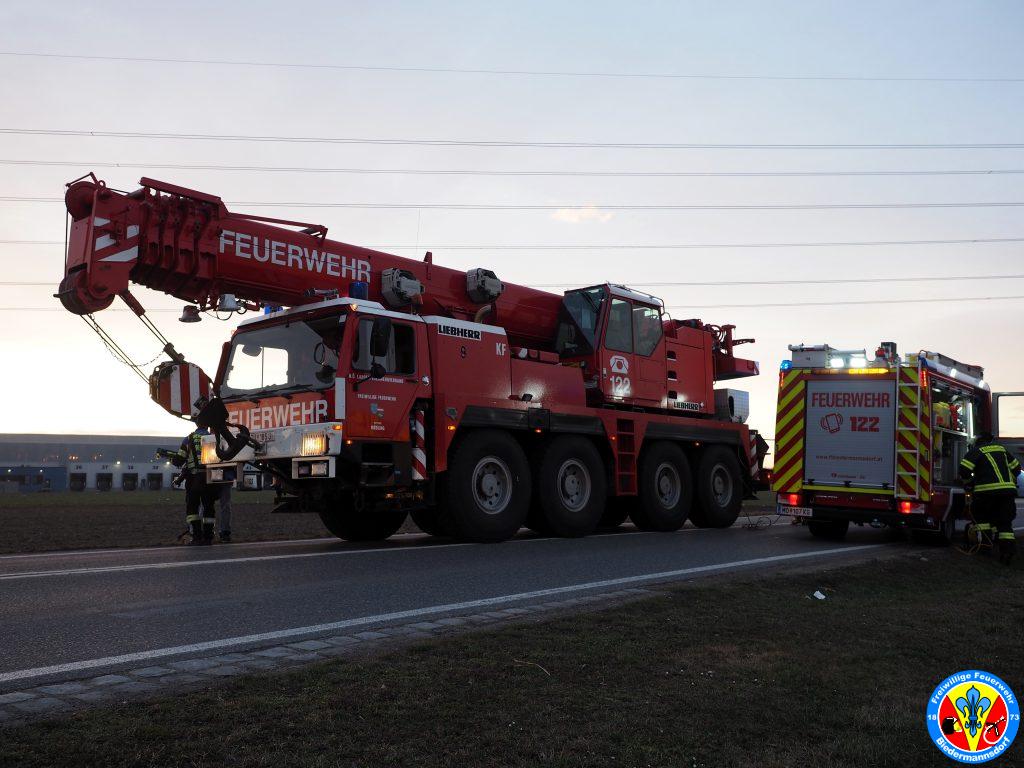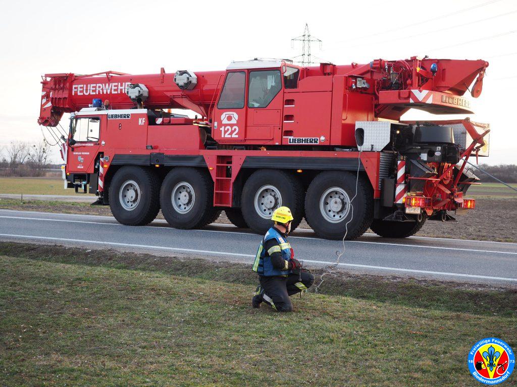 Nach Erkundung und Beratung der Führungskräfte vor Ort entschied man sich für die Alarmierung des Kranfahrzeuges der Stadt Mödling. Eine Bergung mit den uns zur Verfügung stehenden Mitteln wäre schlichtweg zu riskant gewesen.