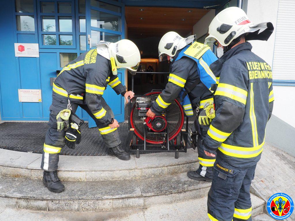 Dienstagfrüh wurden wir zu einer automatischen Brandmelderauslösung alarmiert. Vor Ort wies uns der Geschäftsführer ein und gab an, dass der Alarmgrund eine angebrannte Speise in der Teeküche war. Es konnte im Küchenbereich eine Verrauchung festgestellt werden. Das Brandgut selbst war bereits gekühlt abgelegt worden. Um die Verrauchung aus der fensterlosen Teeküche zu bekommen, wurde der Bereich mit einem Druckbelüfter gelüftet.