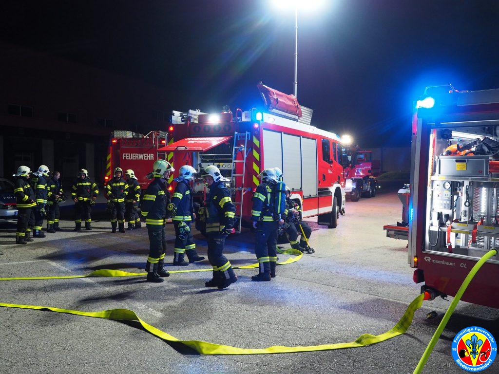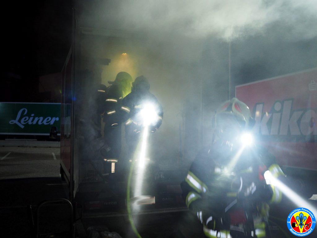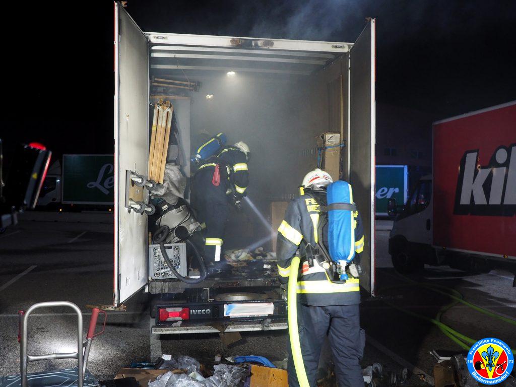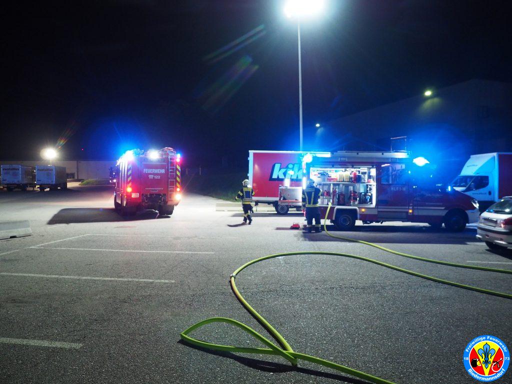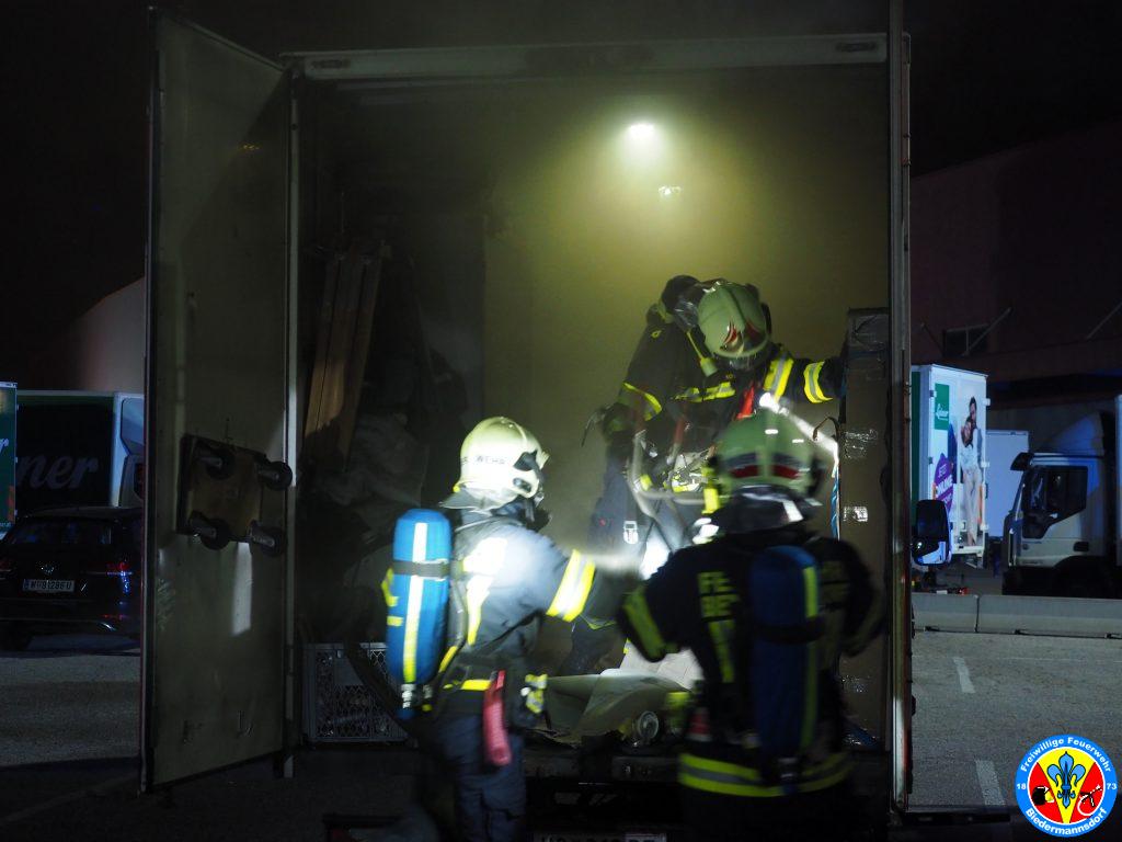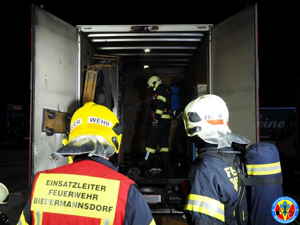 „Rauch aus Lkw“ lautete die Alarmierung mit welcher wir zum dritten Einsatz am Mittwoch den 15. September kurz nach 23.00 Uhr mittels Sirene, Pager und Alarm Apps durch die BAZ Mödling in das Industriezentrum-Süd alarmiert wurden. Kurz nach der Alarmierung rückten 7 Fahrzeuge und 26 Mitglieder zur Einsatzstelle aus. Vor Ort konnte eine Rauchentwicklung aus dem Kastenaufbau eines Montage-LKW festgestellt werden. Mittels hydraulischen Spreizer des Hilfeleistungsfahrzeuges wurden die Hecktüren des LKW geöffnet. Aus unbekannter Ursache waren Teile der Ladung in Brand geraten. Der Kleinbrand wurde unter Vornahme eines C-Rohres durch einen Atemschutztrupp abgelöscht. Die glosenden Teile der Ladung wurden in weiterer Folge aus dem Lkw verbracht. Zum Abschluss erfolgte eine Nachkontrolle mittels Wärmebildkamera. Nach Beendigung dieser Arbeiten wurde die Einsatzstelle an die Polizei übergeben.