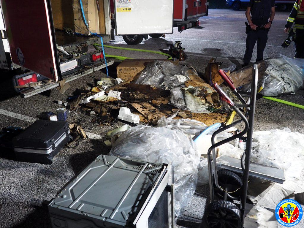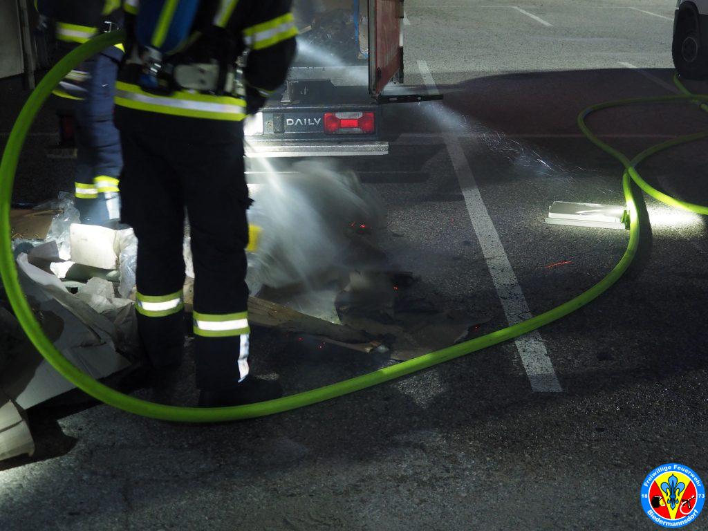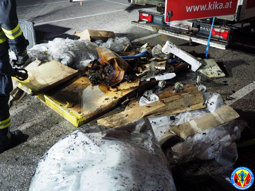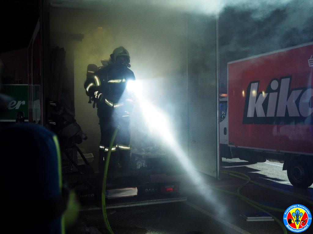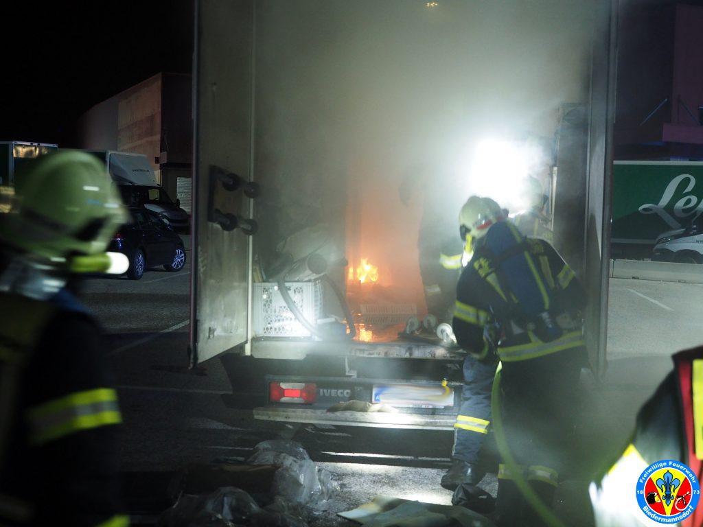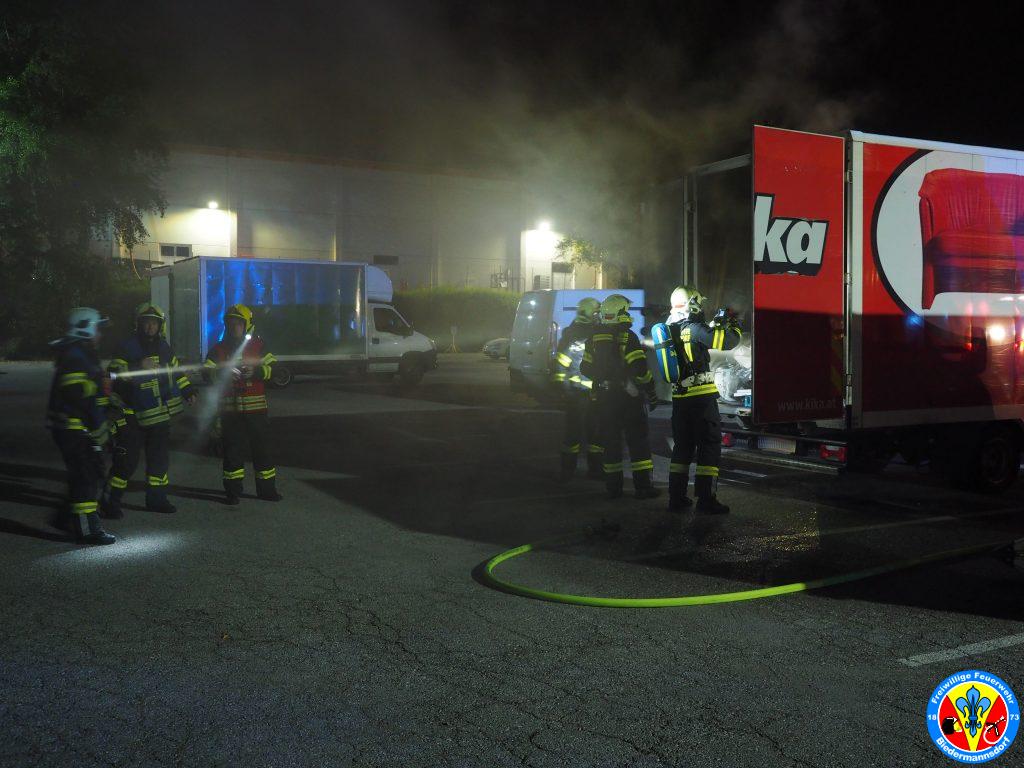 „Rauch aus Lkw“ lautete die Alarmierung mit welcher wir zum dritten Einsatz am Mittwoch den 15. September kurz nach 23.00 Uhr mittels Sirene, Pager und Alarm Apps durch die BAZ Mödling in das Industriezentrum-Süd alarmiert wurden. Kurz nach der Alarmierung rückten 7 Fahrzeuge und 26 Mitglieder zur Einsatzstelle aus. Vor Ort konnte eine Rauchentwicklung aus dem Kastenaufbau eines Montage-LKW festgestellt werden. Mittels hydraulischen Spreizer des Hilfeleistungsfahrzeuges wurden die Hecktüren des LKW geöffnet. Aus unbekannter Ursache waren Teile der Ladung in Brand geraten. Der Kleinbrand wurde unter Vornahme eines C-Rohres durch einen Atemschutztrupp abgelöscht. Die glosenden Teile der Ladung wurden in weiterer Folge aus dem Lkw verbracht. Zum Abschluss erfolgte eine Nachkontrolle mittels Wärmebildkamera. Nach Beendigung dieser Arbeiten wurde die Einsatzstelle an die Polizei übergeben.