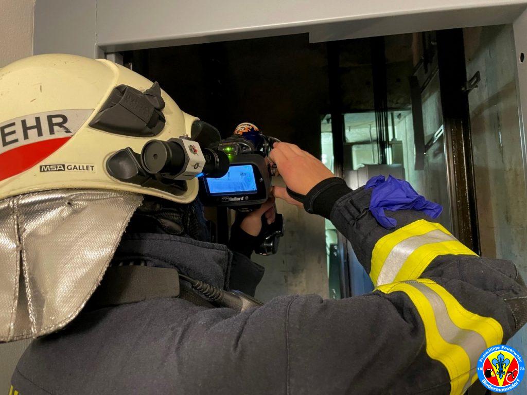 Vorort konnte durch uns ebenfalls ein leichter Brandgeruch aus dem Aufzugsschacht wahrgenommen werden. Das Aufzugtriebwerk samt Kabine und Schacht wurde mittels Wärmebildkamera kontrolliert. Vermutlich entstand der Brandgeruch aus einem kleinen defekten Steuerungskasten auf der Oberseite der Kabine. Der Aufzug wurde gänzlich stromlos geschalten, gesperrt und über die Bezirksalarmzentrale der Aufzugbetreiber vom Sachverhalt in Kenntnis gesetzt.