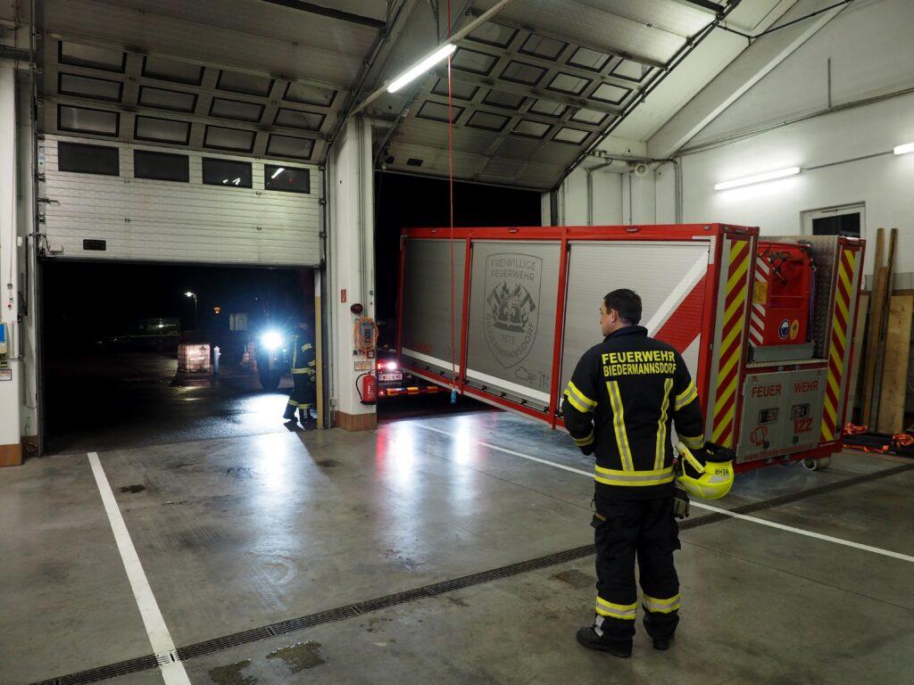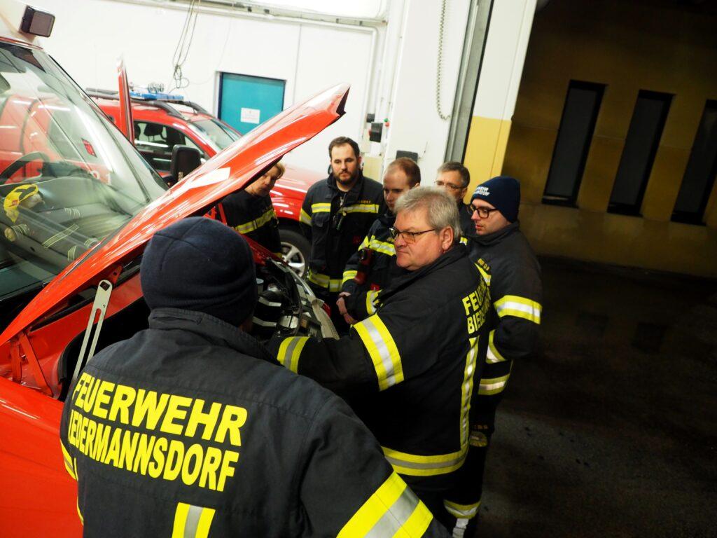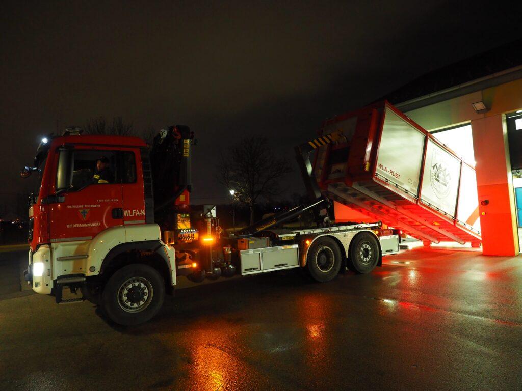 Die Einsatzmaschinisten trainierten das Auf,- und Abladen des WLA-Rüst und das Entnehmen des Arbeitskorb aus dem WLA. Weiters wurde der Kontrollmerksatz WOLKE (Wasser, Öl, Kraftstoff, Energie) Anhand des HLF 1-W und MTF geschult.