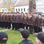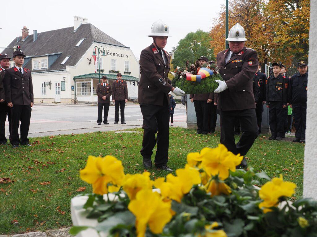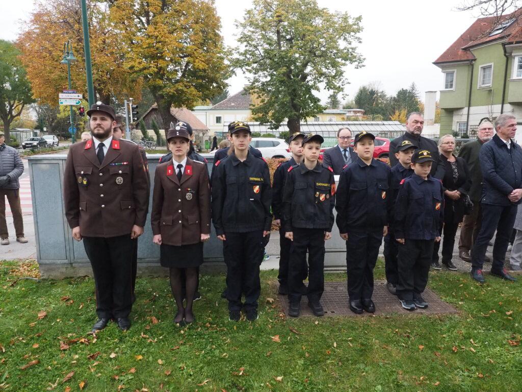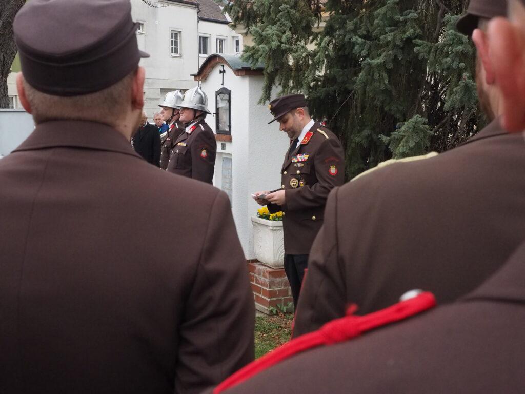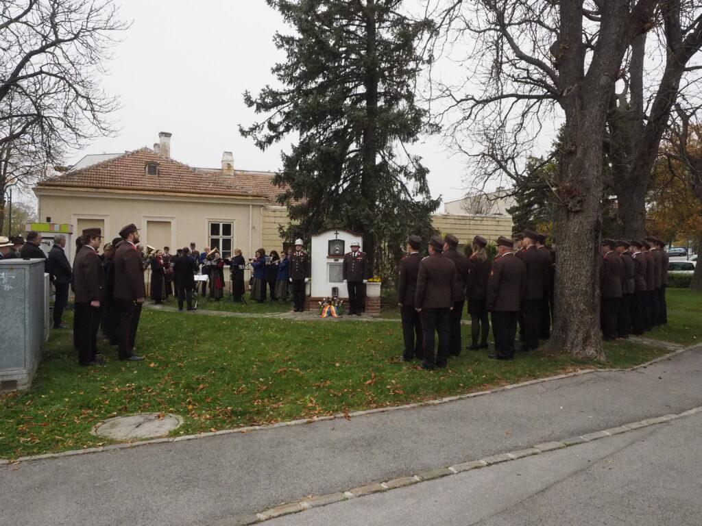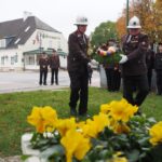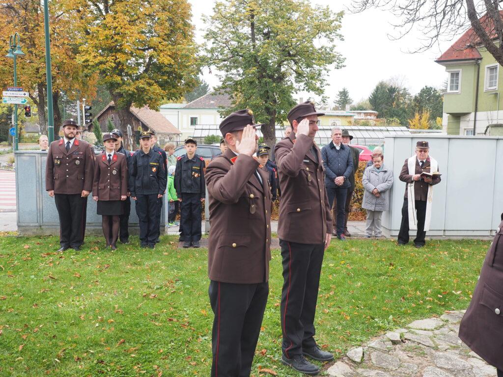 Beschreibung: Allerheiligen bedeutet für die Mitglieder der Feuerwehr traditionell Kranzniederlegung und Andacht für verstorbene Kameradinnen und Kameraden nehmen. Samstagvormittag folgten rund 40 Mitglieder der Tradition und ehrten die verstorbenen Kameraden beim Denkmal. Im Anschluss lud die Gemeinde zu Speis und Trank in das Feuerwehrhaus