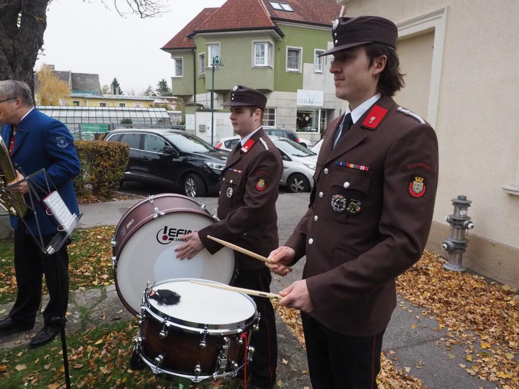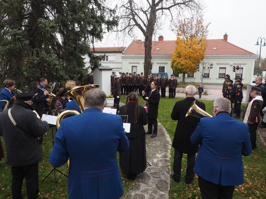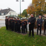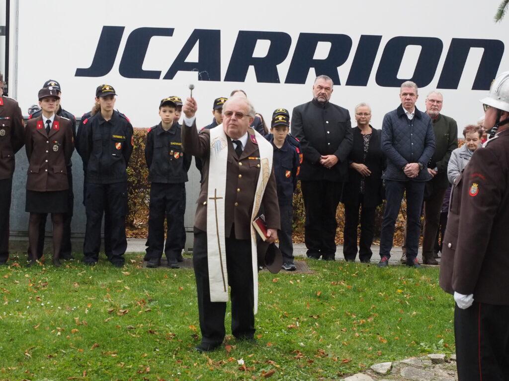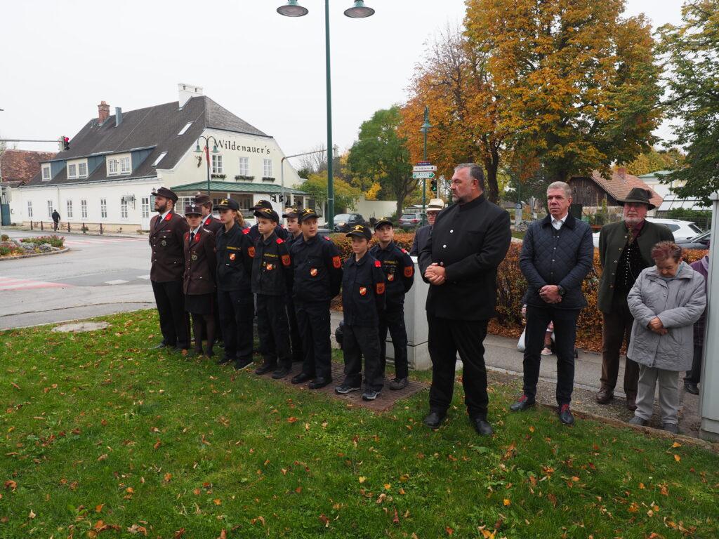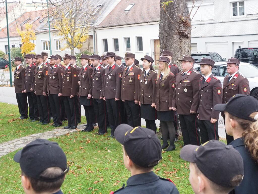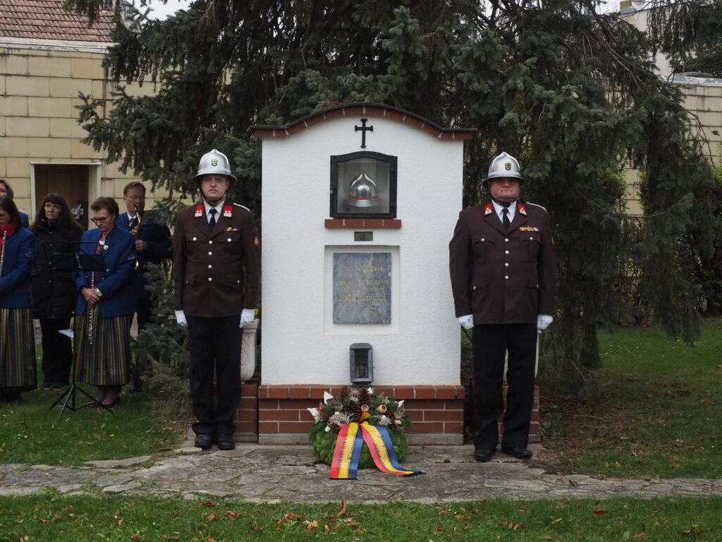 Beschreibung: Allerheiligen bedeutet für die Mitglieder der Feuerwehr traditionell Kranzniederlegung und Andacht für verstorbene Kameradinnen und Kameraden nehmen. Samstagvormittag folgten rund 40 Mitglieder der Tradition und ehrten die verstorbenen Kameraden beim Denkmal. Im Anschluss lud die Gemeinde zu Speis und Trank in das Feuerwehrhaus
