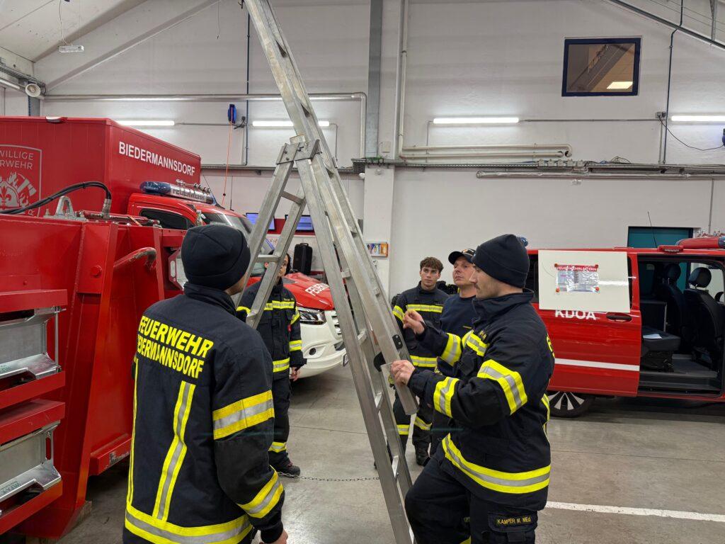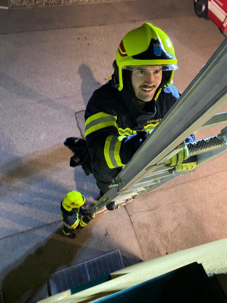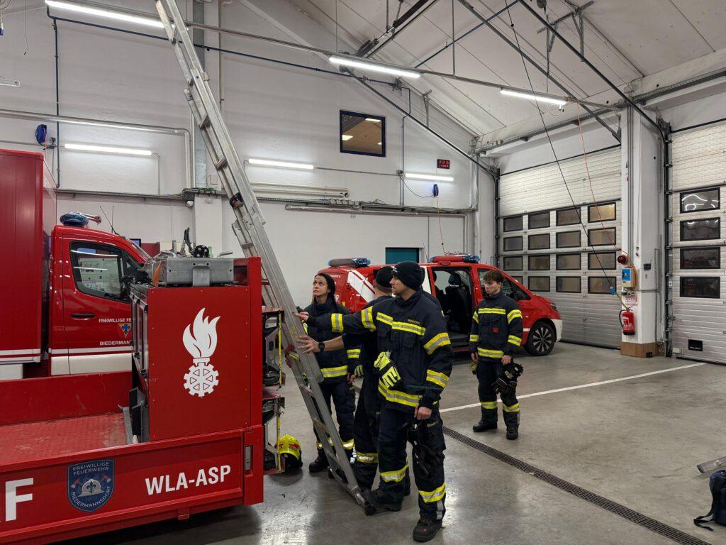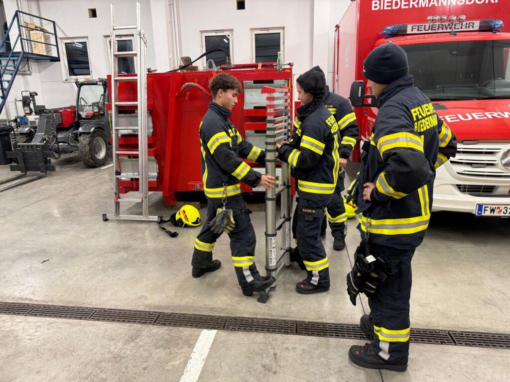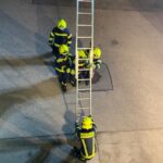 Die Mitglieder der Gruppe 1 wurden im Umgang mit den Leitern im Feuerwehrdienst geschult. Zu Beginn wurde in der Fahrzeughalle erklärt wann welche Leiter zielführend ist und wo welche Leitern in den Fahrzeugen gelagert ist. Im Anschluss wurden die Mehrzweckleiter, Teleskopleiter, Steck,- und Schiebeleiter praktisch beübt. Im Zuge dessen wurde das Übersteigen, die Menschenrettung und das Besteigen mit Strahlrohr trainiert.