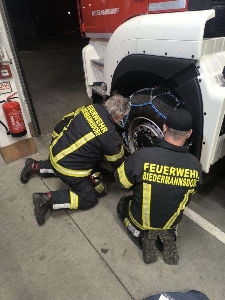 Donnerstagabend wurden an den C-Einsatzfahrzeugen die Schneeketten angelegt um im örtlichen, aber eher im überörtlichen Bereich auch bei Schneelage sofort helfen zu können.