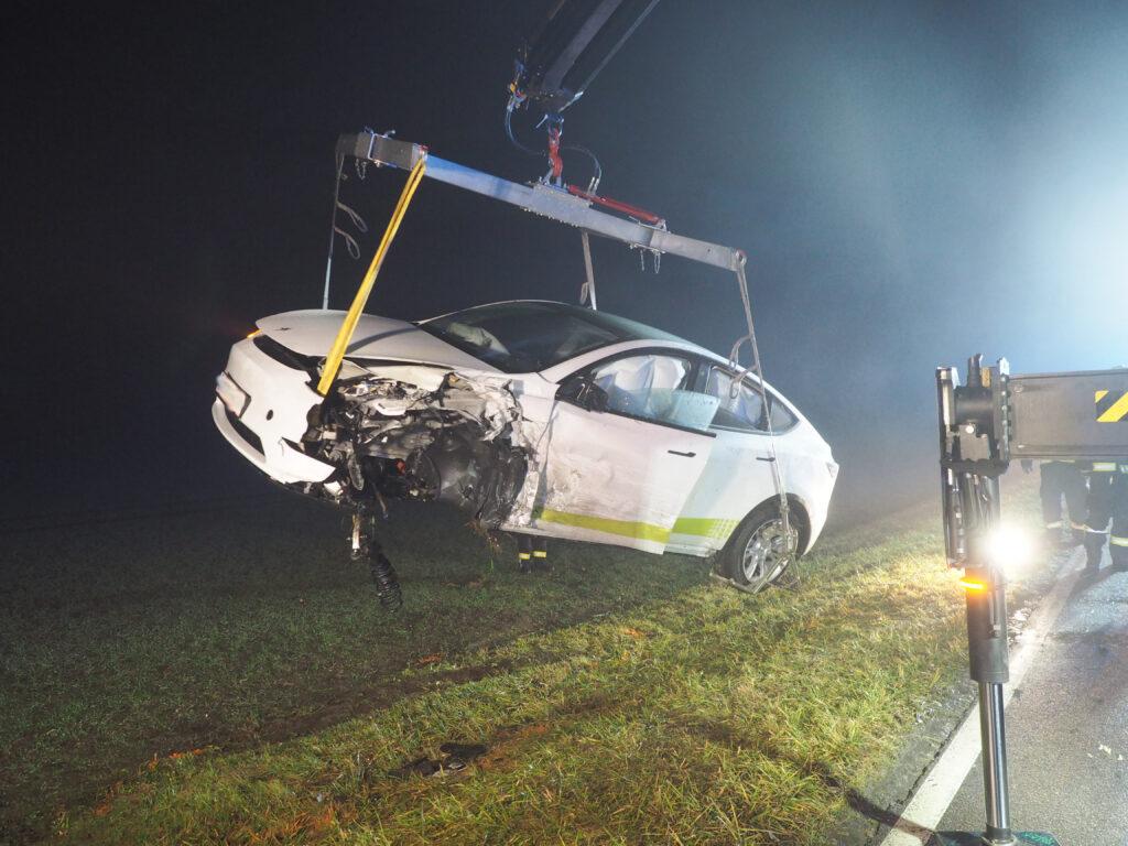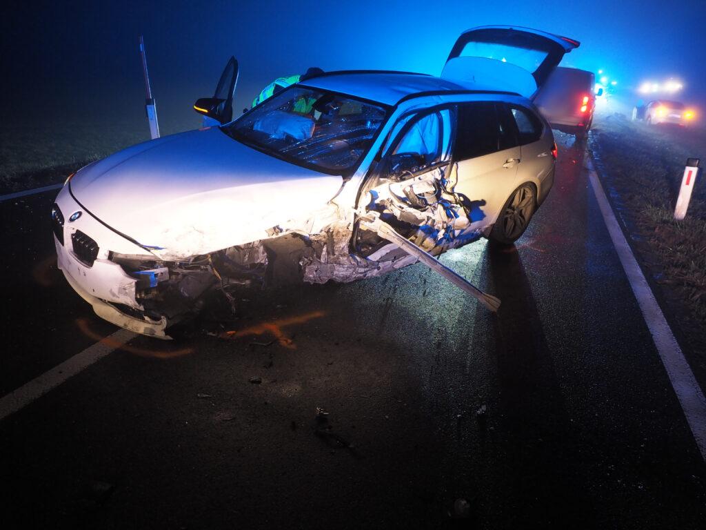 Mit dem Alarmstichwort „Verkehrsunfall, 2 PKW, mehrere Verletzte, E-Fahrzeug inkludiert“ wurden die ehrenamtlichen Kräfte bei dichtem Nebel Freitagabend auf die L154 alarmiert.
