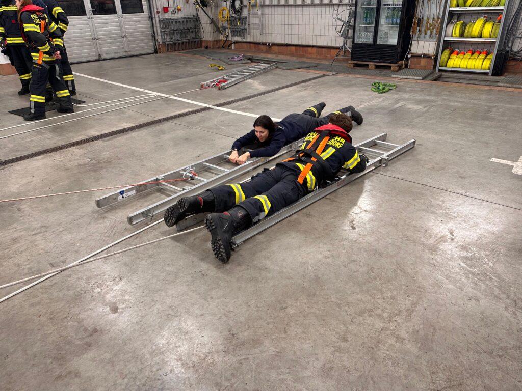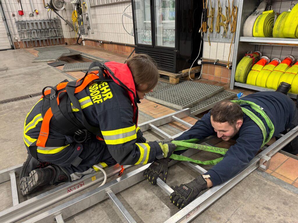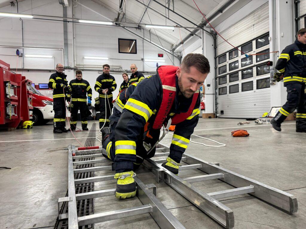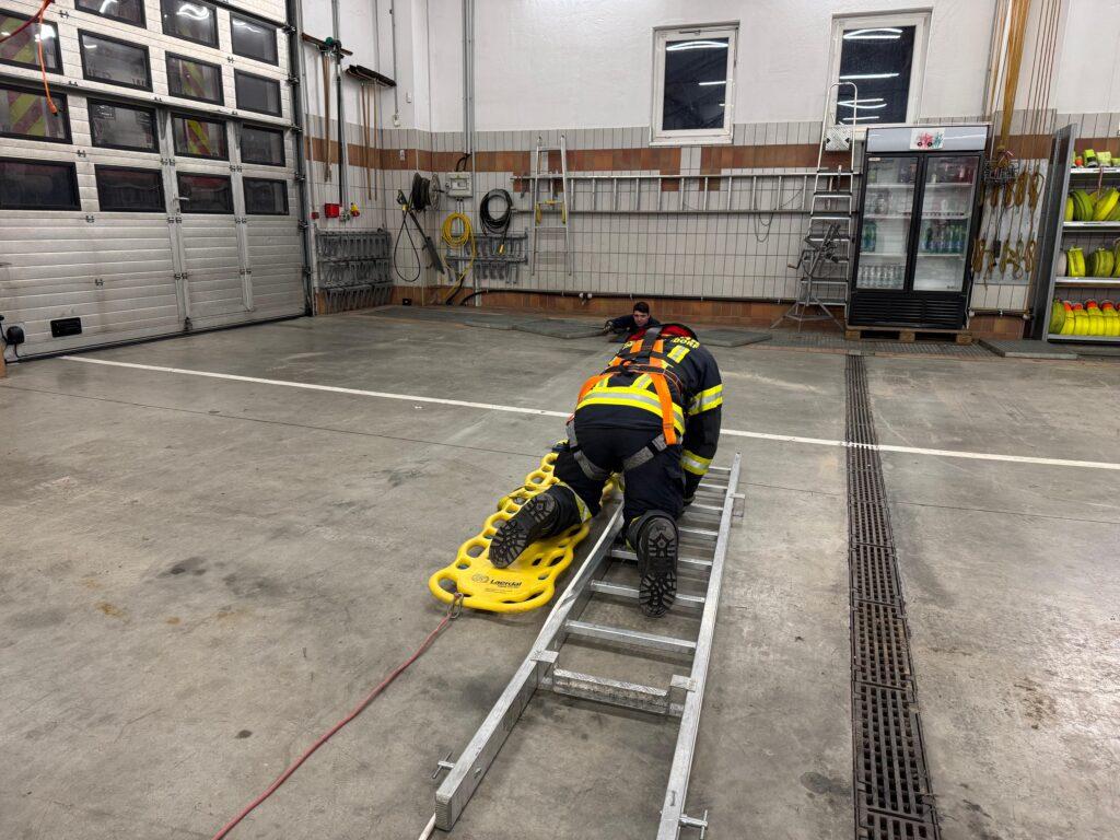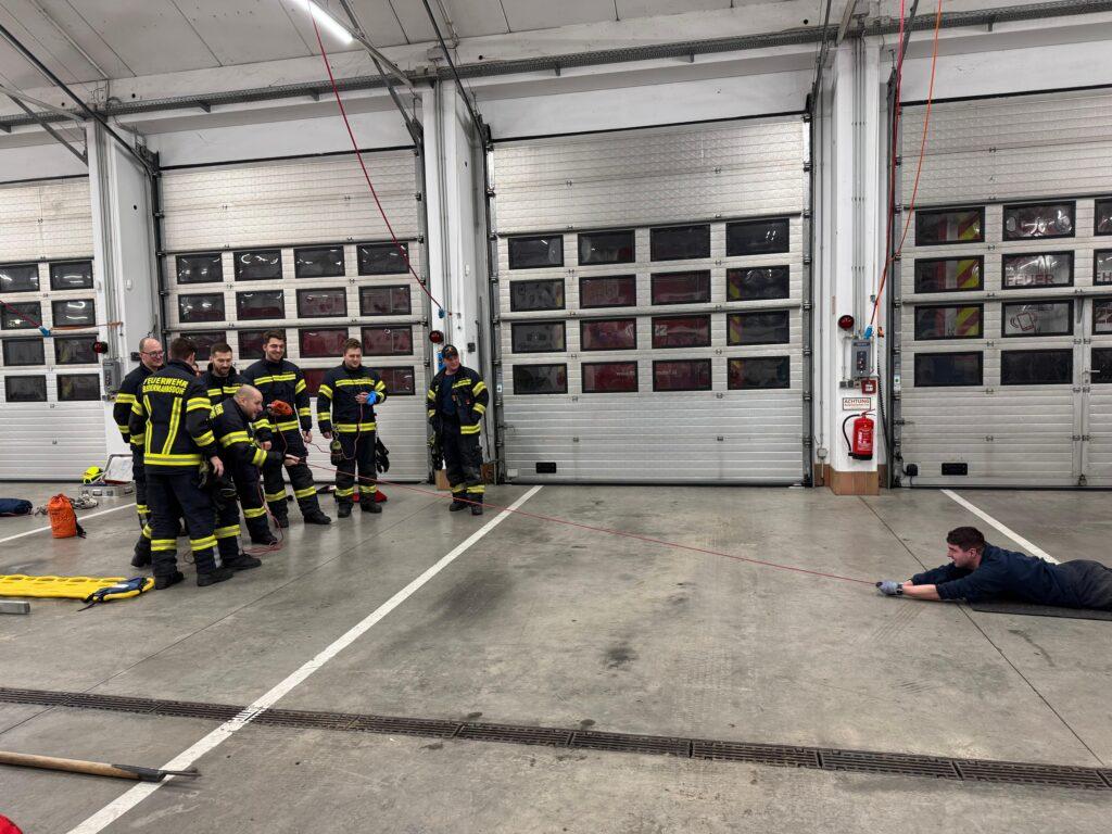 Da die derzeitige Witterung ein Üben am Eis nicht zulässt, wurde kurzer Hand die Fahrzeughalle zur fiktiven Eisfläche umgewandelt.