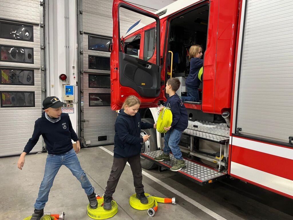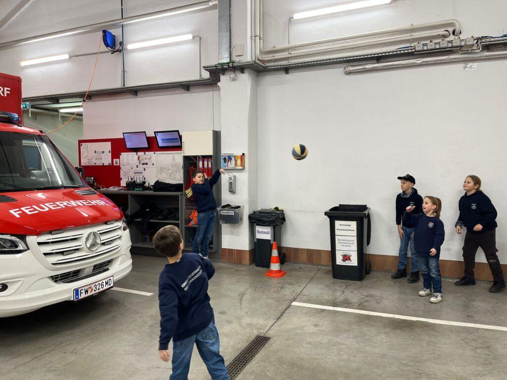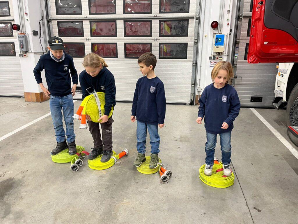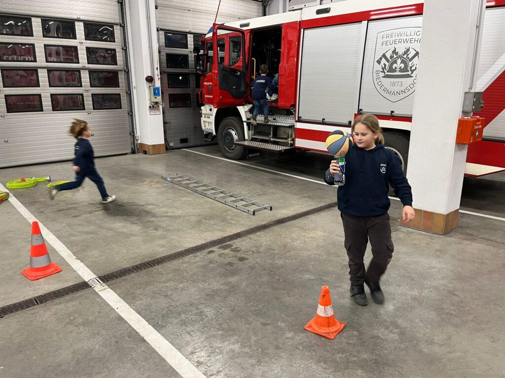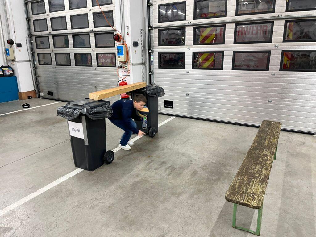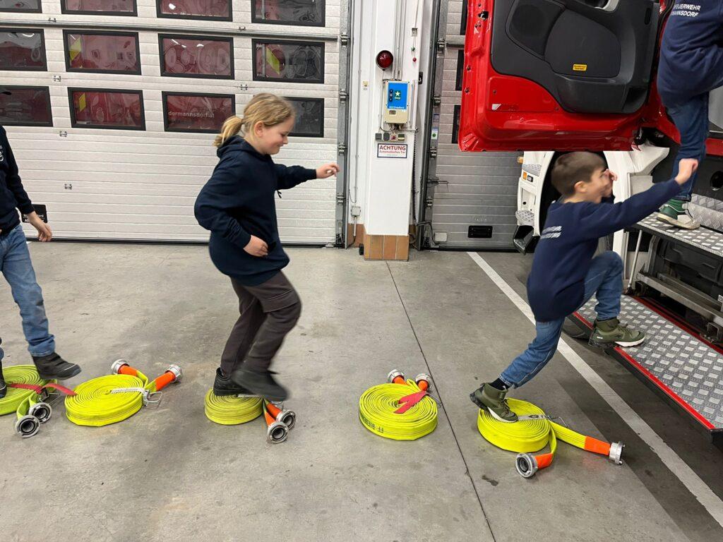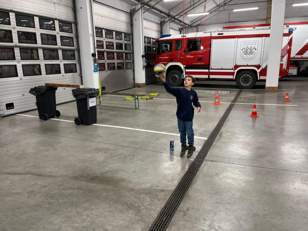 Beschreibung: Am ersten Abend der Kinderfeuerwehr im neuen Jahr, wurde Teambuilding und Spaß in den Fokus gestellt. Die Kinder hatten einen Hindernisparcours zu bewältigen und anschließend im Team die Fahrzeughalle auf Schlauchinseln zu überqueren.