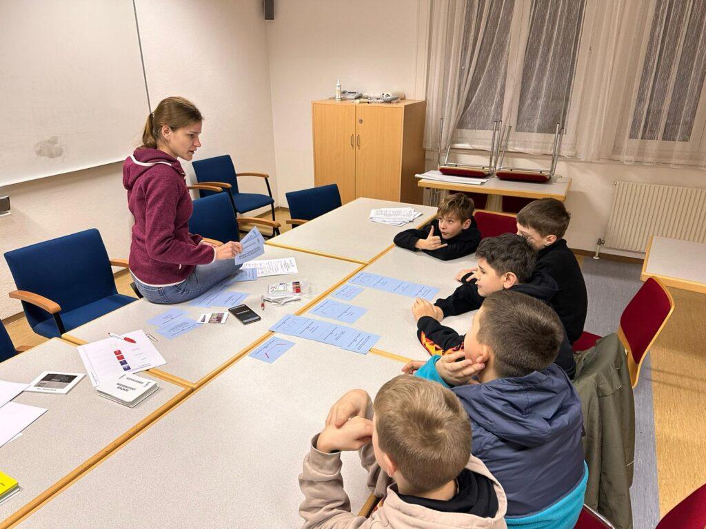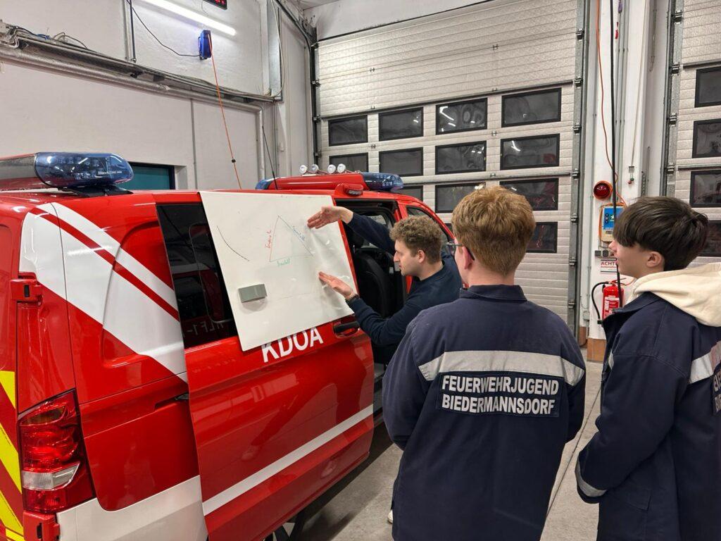 Im Anschluss fand die Vorbereitung für den Wissenstest, ins besonders für das Wissenstestspiel U12 statt. Es wurden die Kleinlöschgeräte, die Handhabung der Funkgeräte, sowie das richtige Verhalten im Brandfall und die Warn,- Alarmsignale geschult.