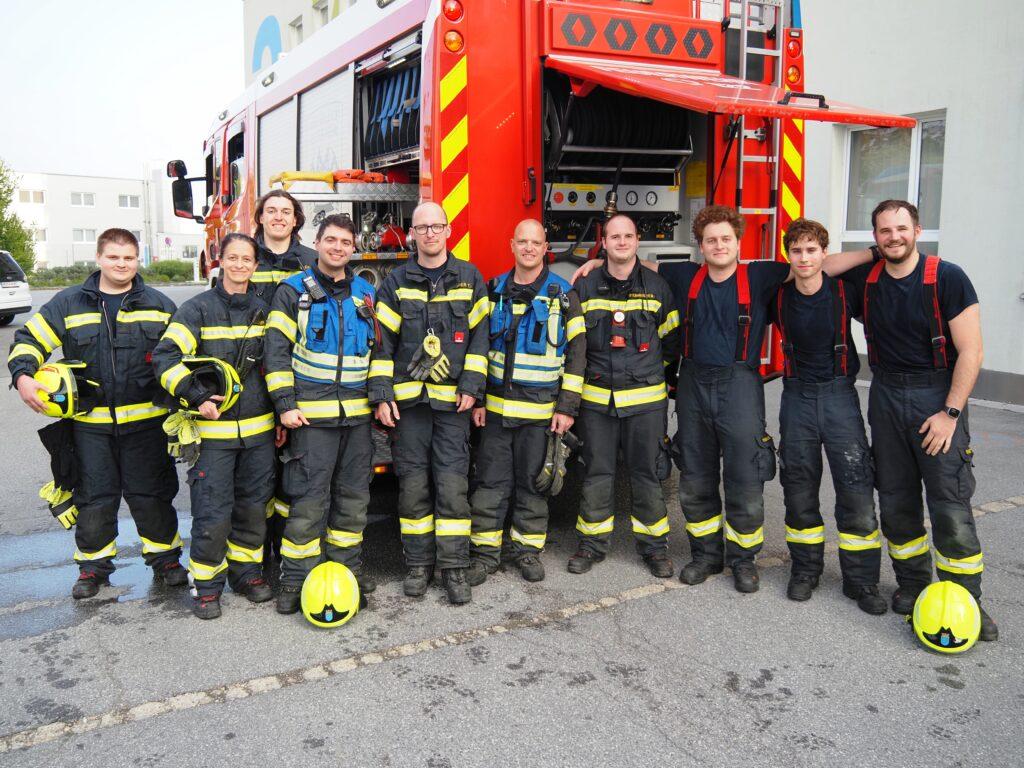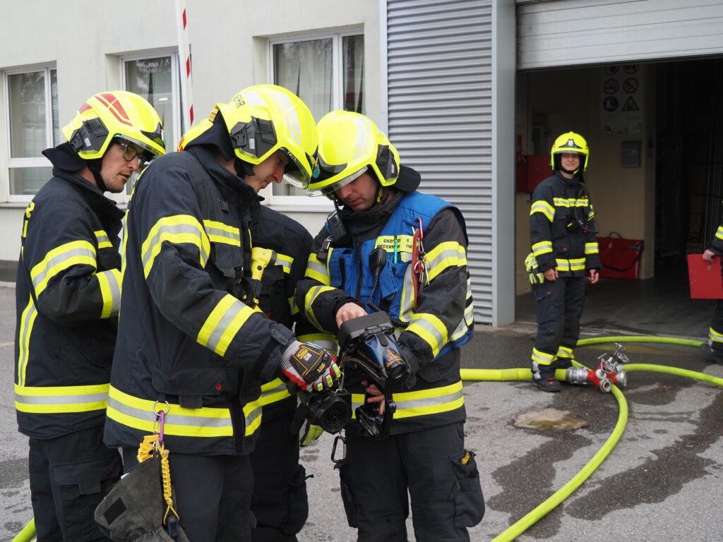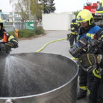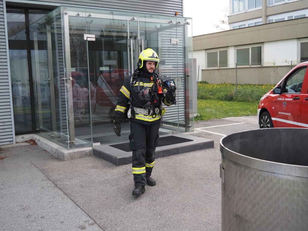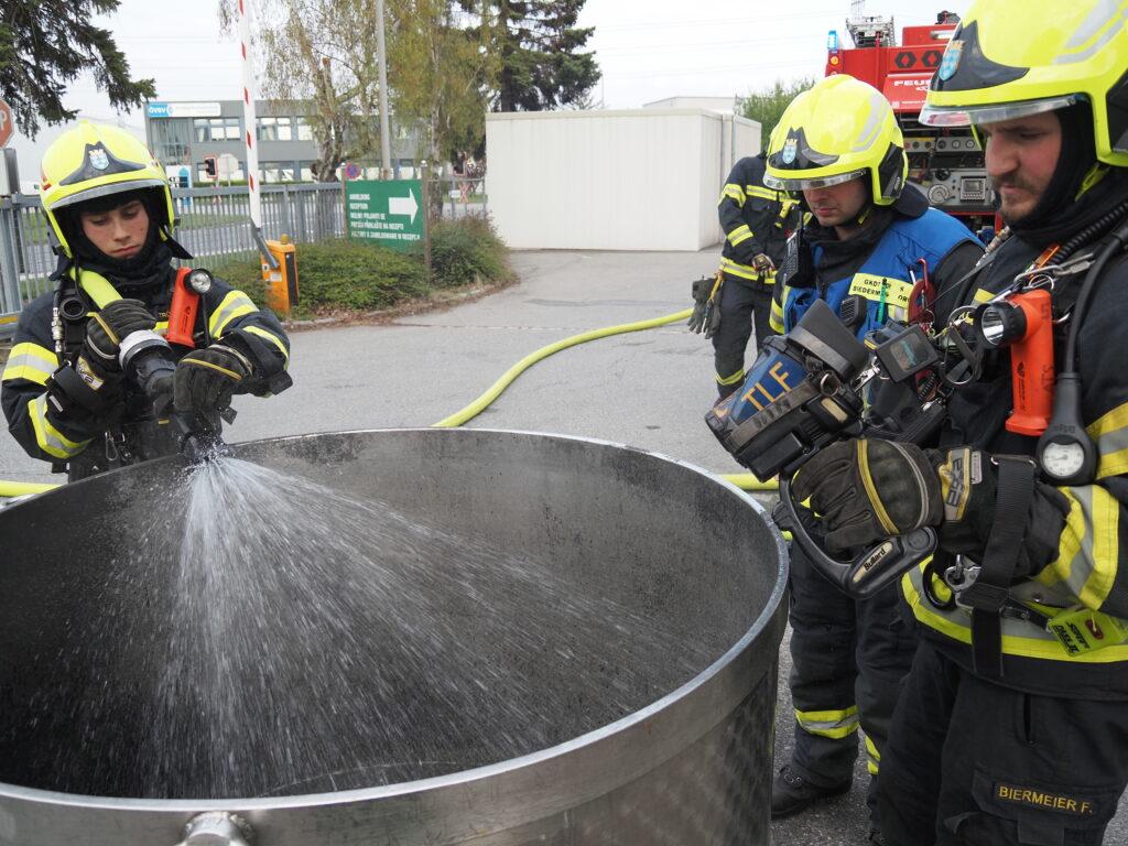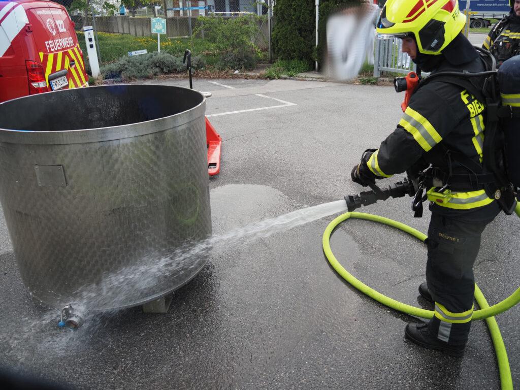 Während eine Wasserversorgung aufgebaut wurde, konnte der Atemschutztrupp den Industriebehälter ins Freie bringen und dieser wurde in weiterer Folge im Freibereich intensiv gekühlt um den chemischen Inhalt unter den Flammpunkt zu bringen um eine Wiederentzündung zu verhindern.